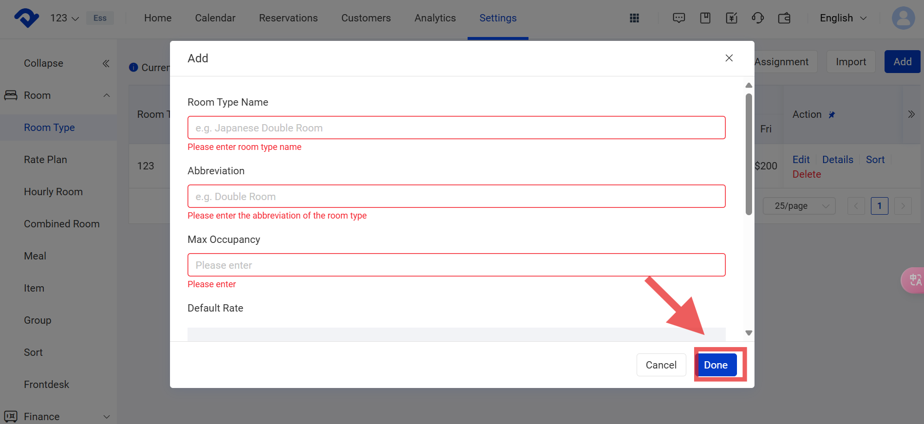 Step3: Fill in the Room Type Name, Abbreviation, Max Occupancy, Default Rate and Room Number. Click Done.