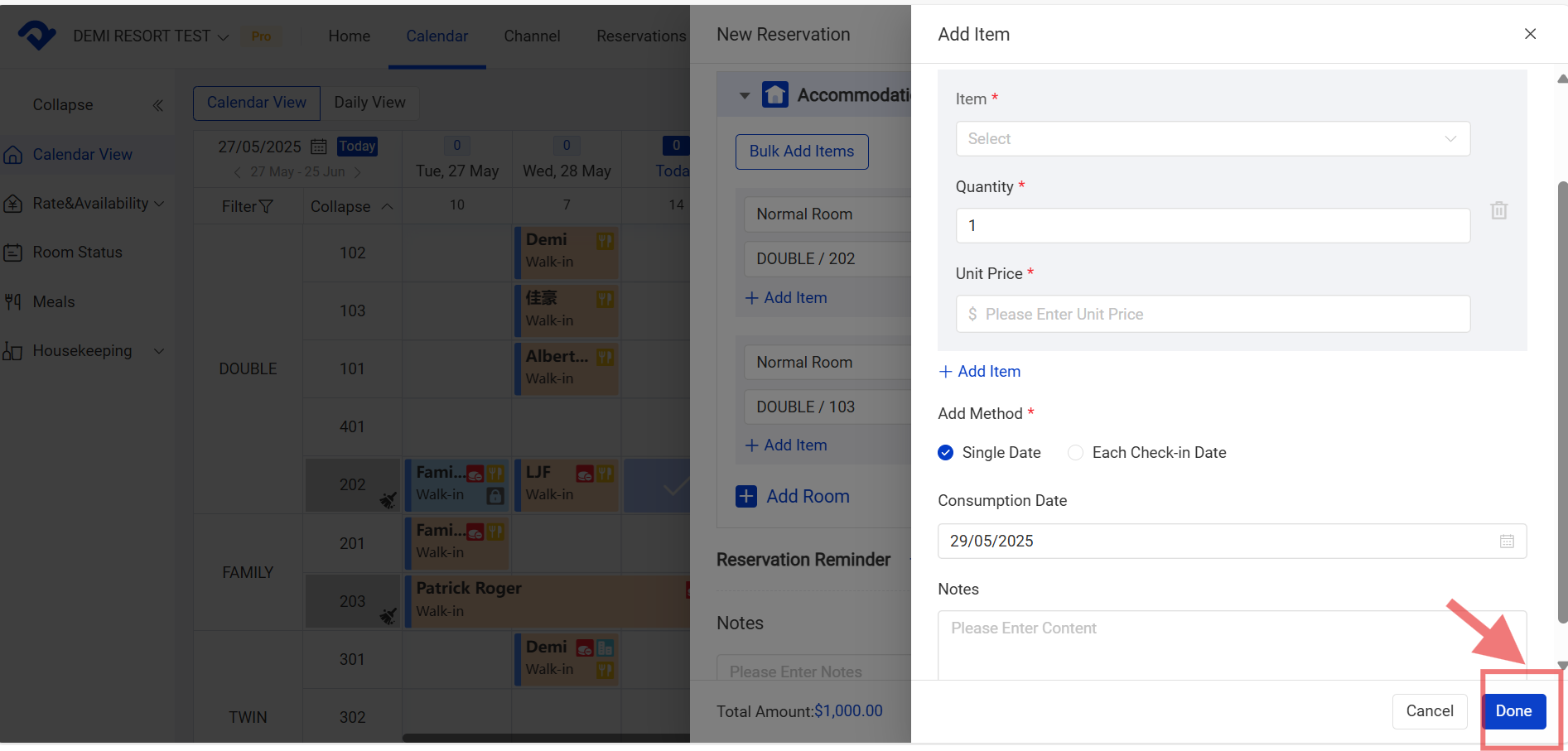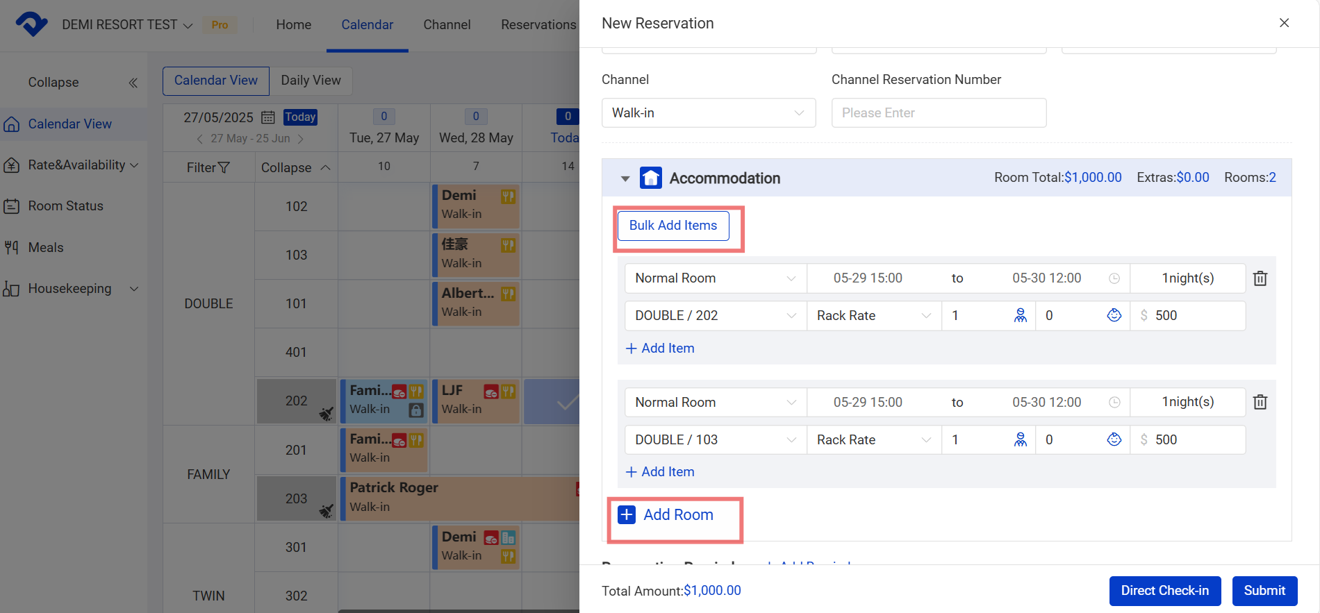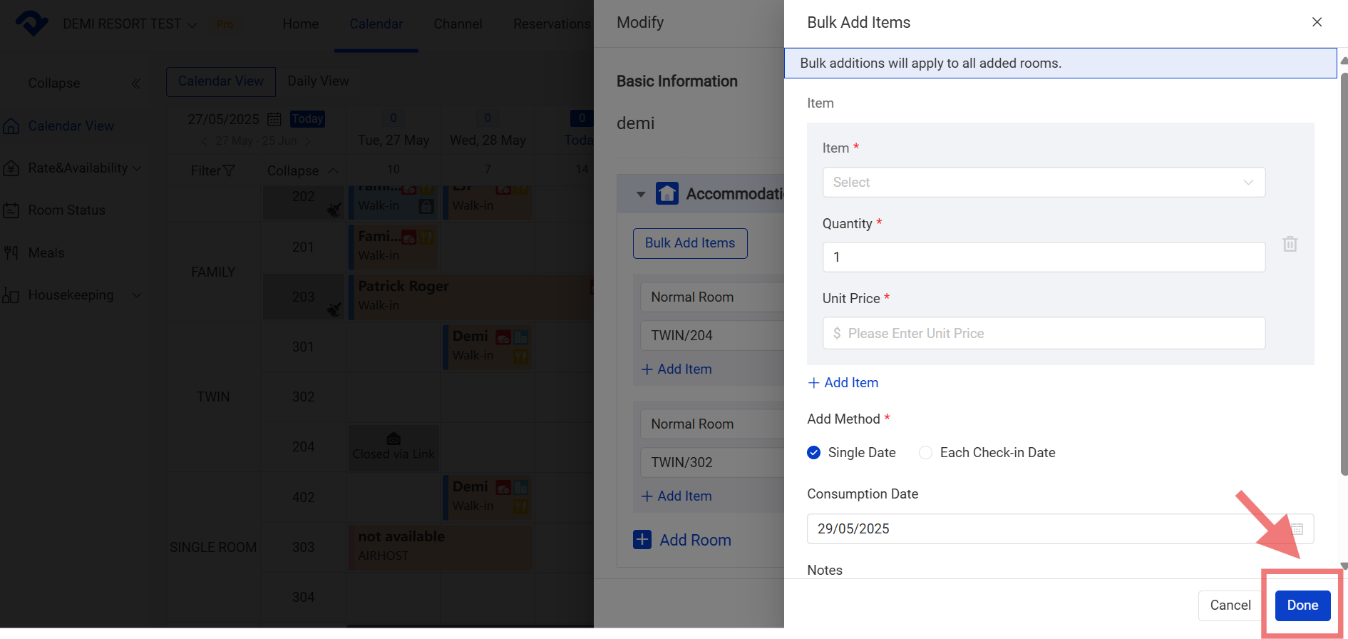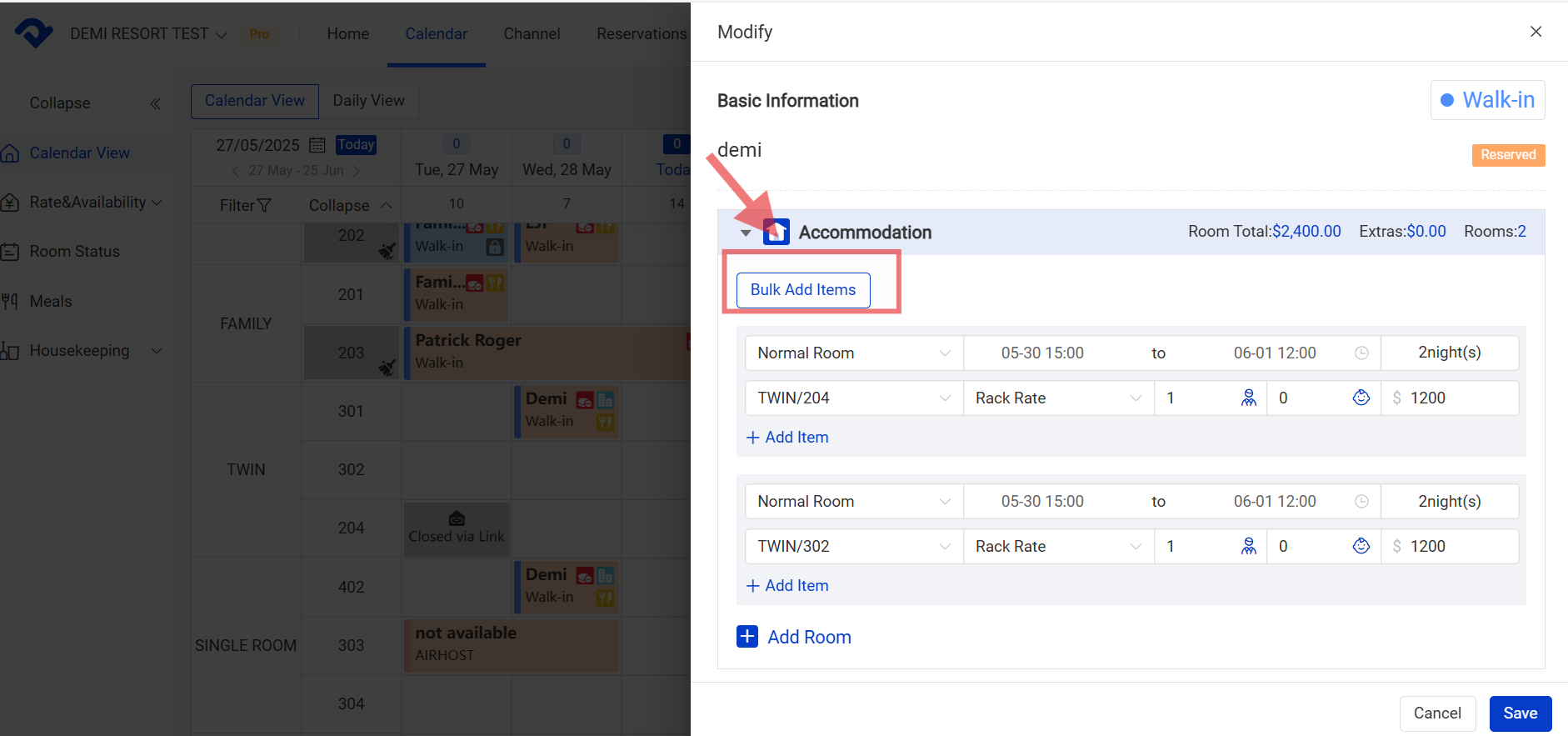 Step1: You can select Add Item under the room to record extras on this room. Or you can select Bulk Add Items to record extras on all the added rooms of this reservation.