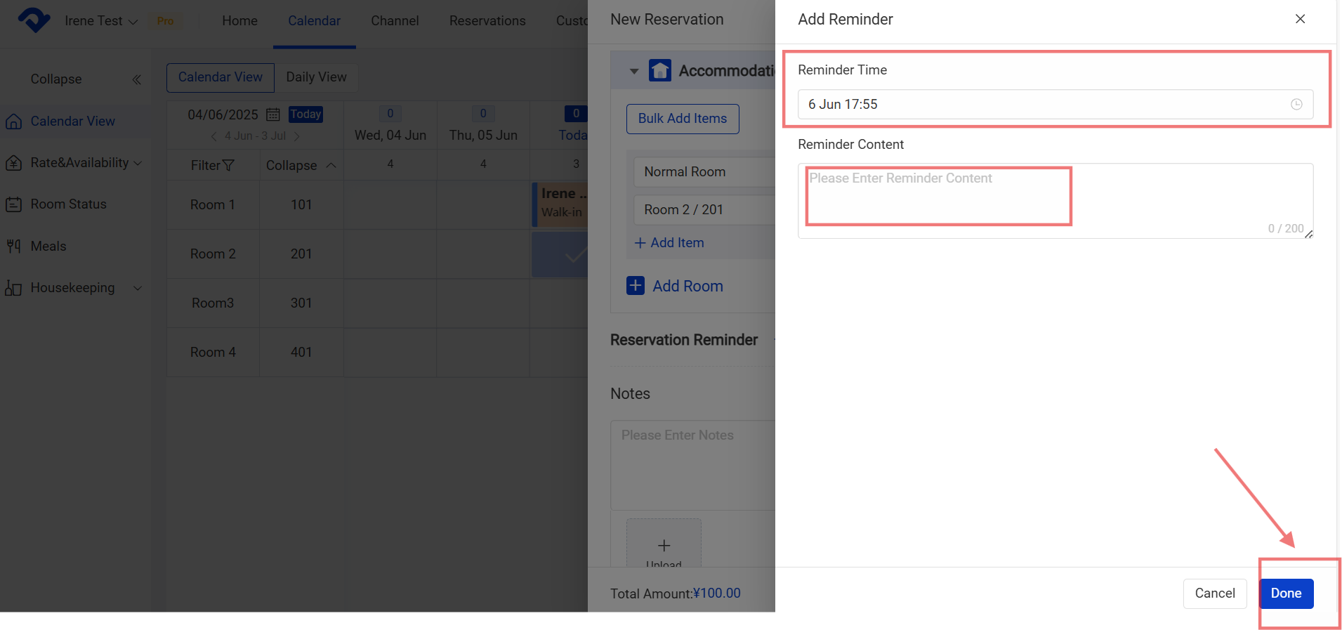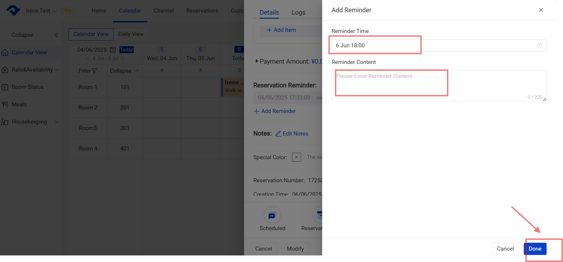 Step for a newly created reservation: When you are creating the new reservation, you select Add Reminder. Fill in the Reminder Time, Reminder Content. Click Done.