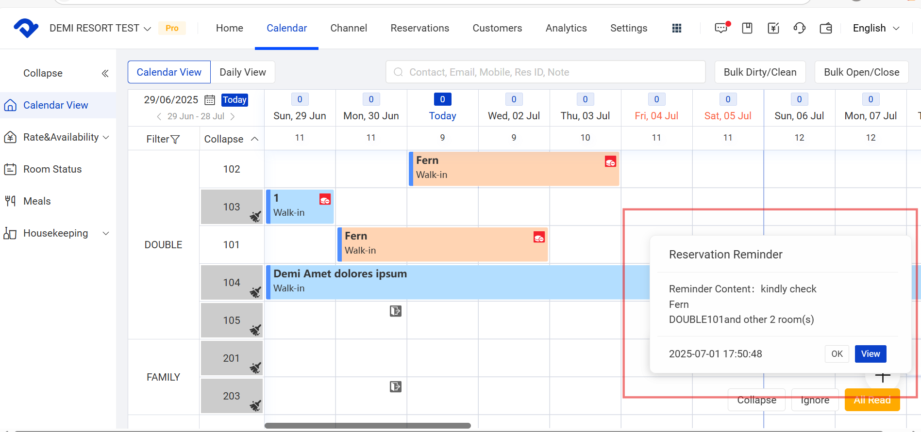 Once the reminder has been added, there will be a pop-up box to show the content, customer name and phone number, reservation room type and room number, and the reminder time. You can click the Review to go directly to the reservation details.