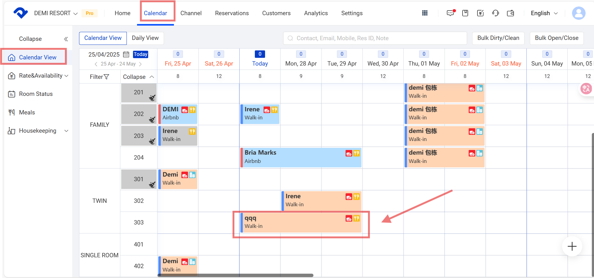 Step1: Go to the Calendar page and find the reservation you want to change the room assignment for.