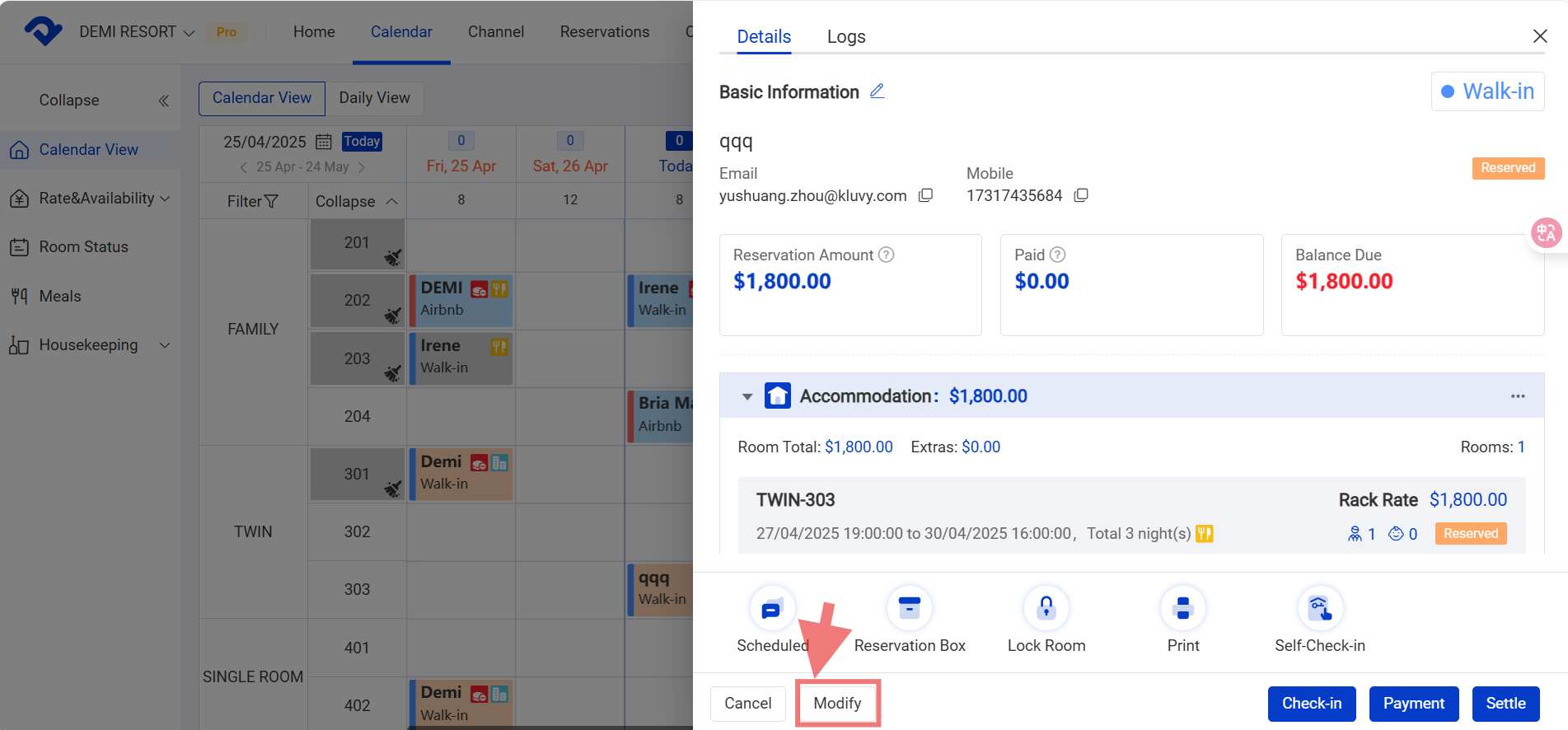 Step2: Click the reservation and go to the Details page. Select Modify.