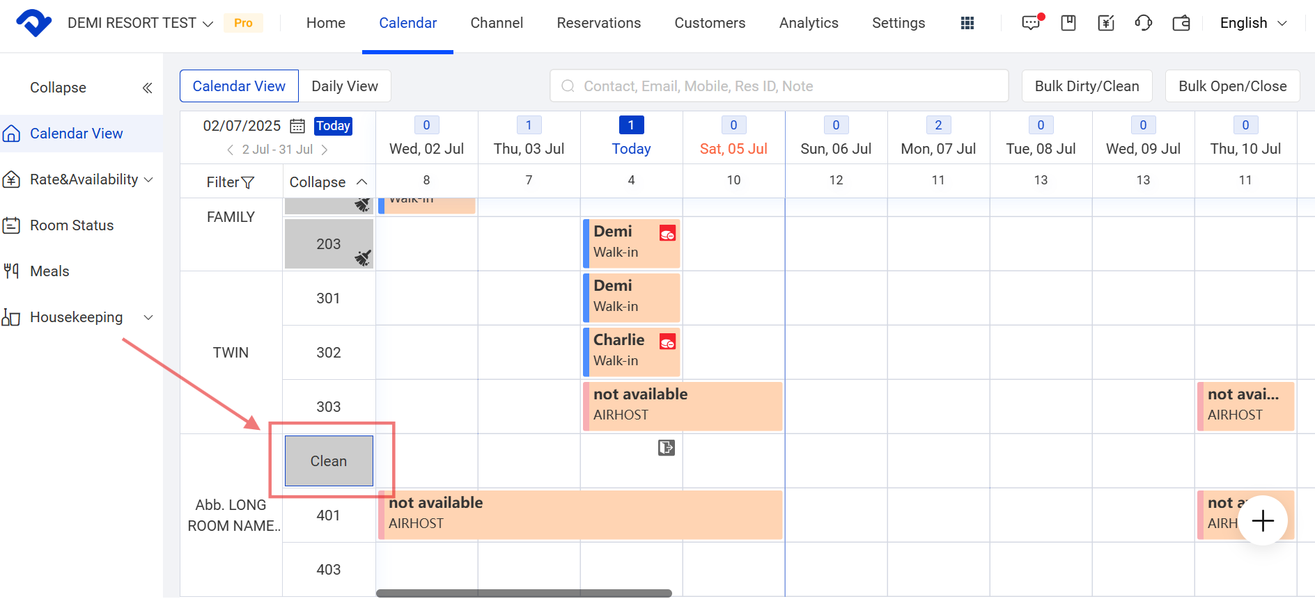 Go to the Calendar View and move to the dirty room, you will see Clean in the room. After you click the room, the status will become
