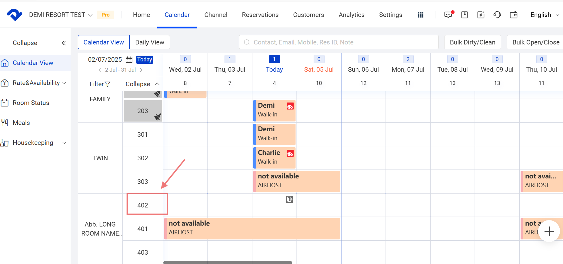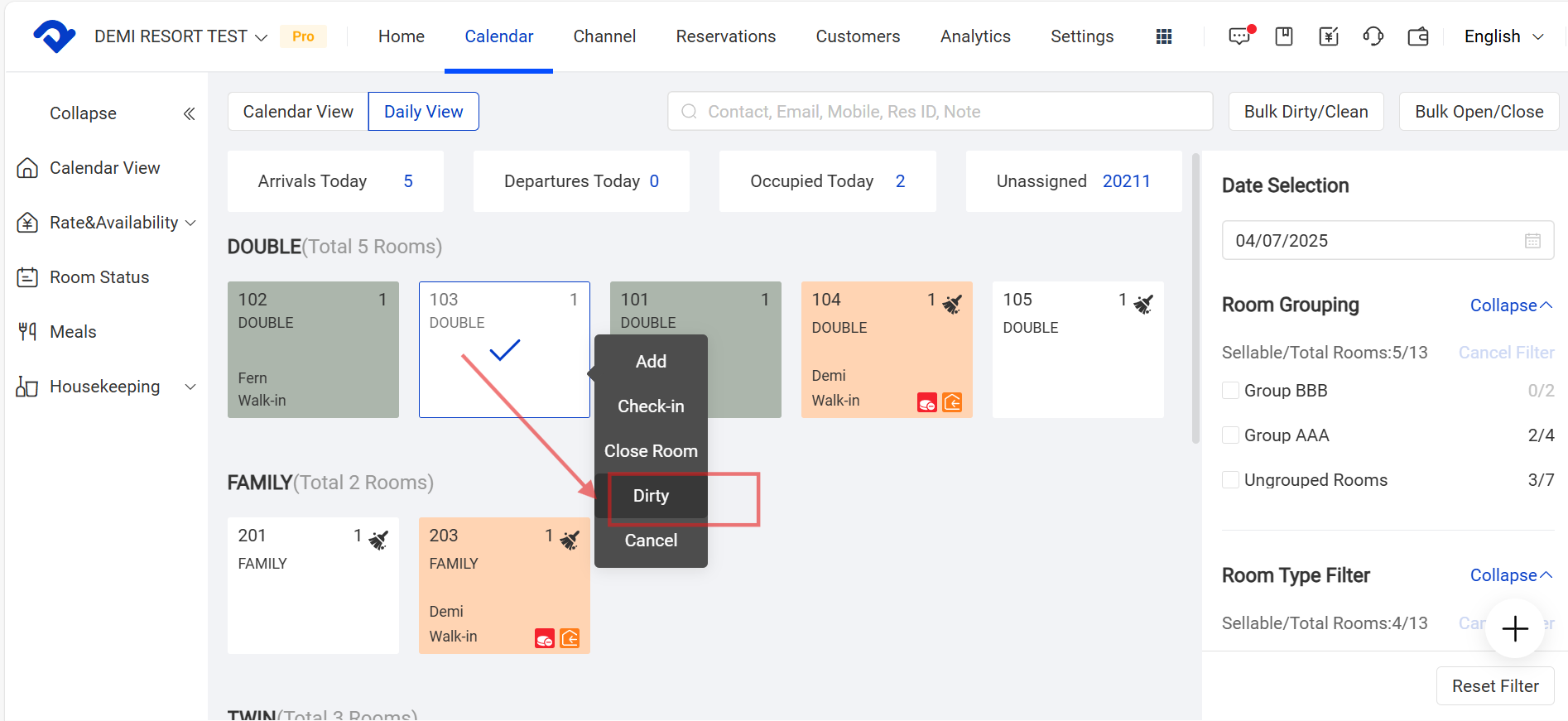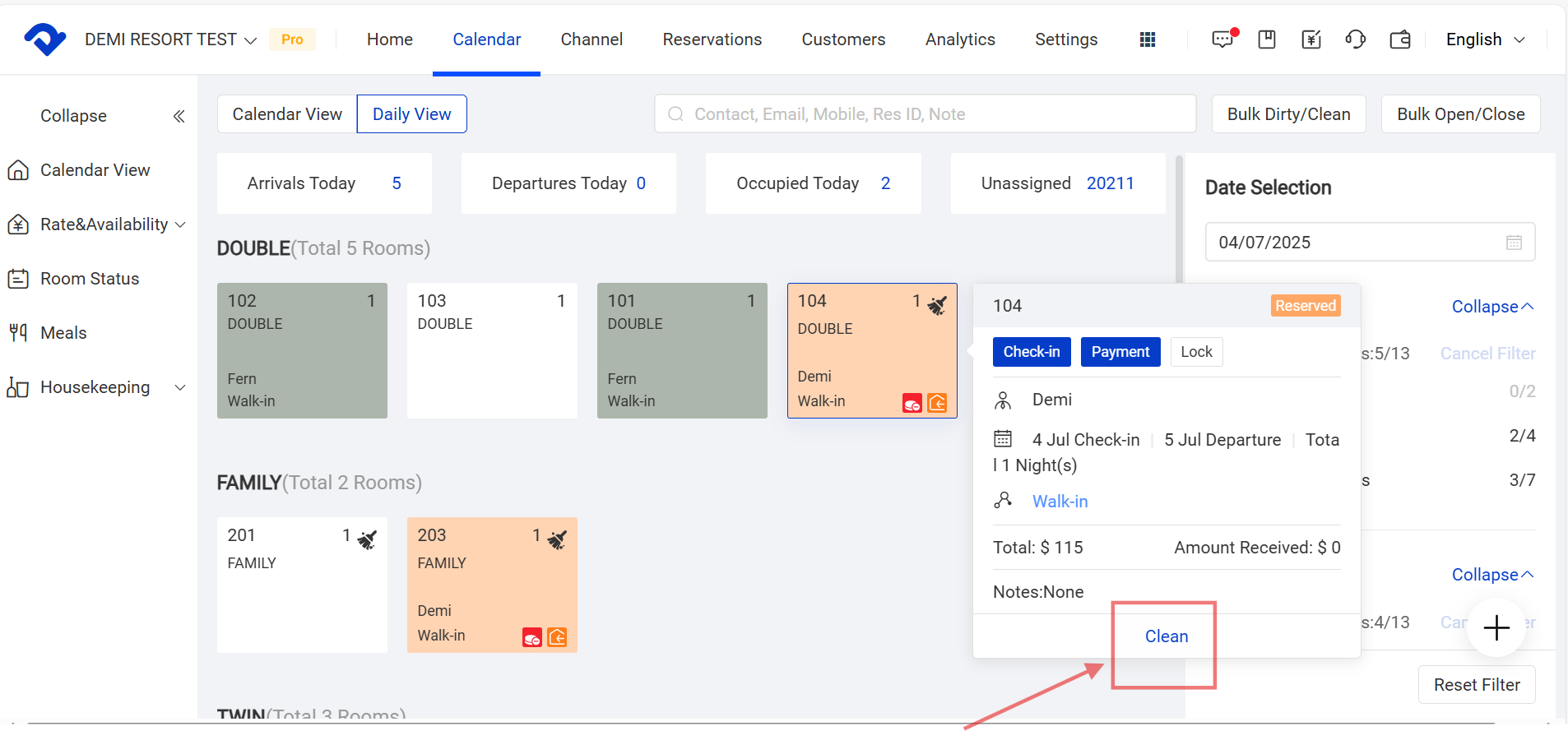 Once the reservation has been settled, the room will be made dirty. After the housekeeping task has been completed, you need to convert the dirty room to a clean room.