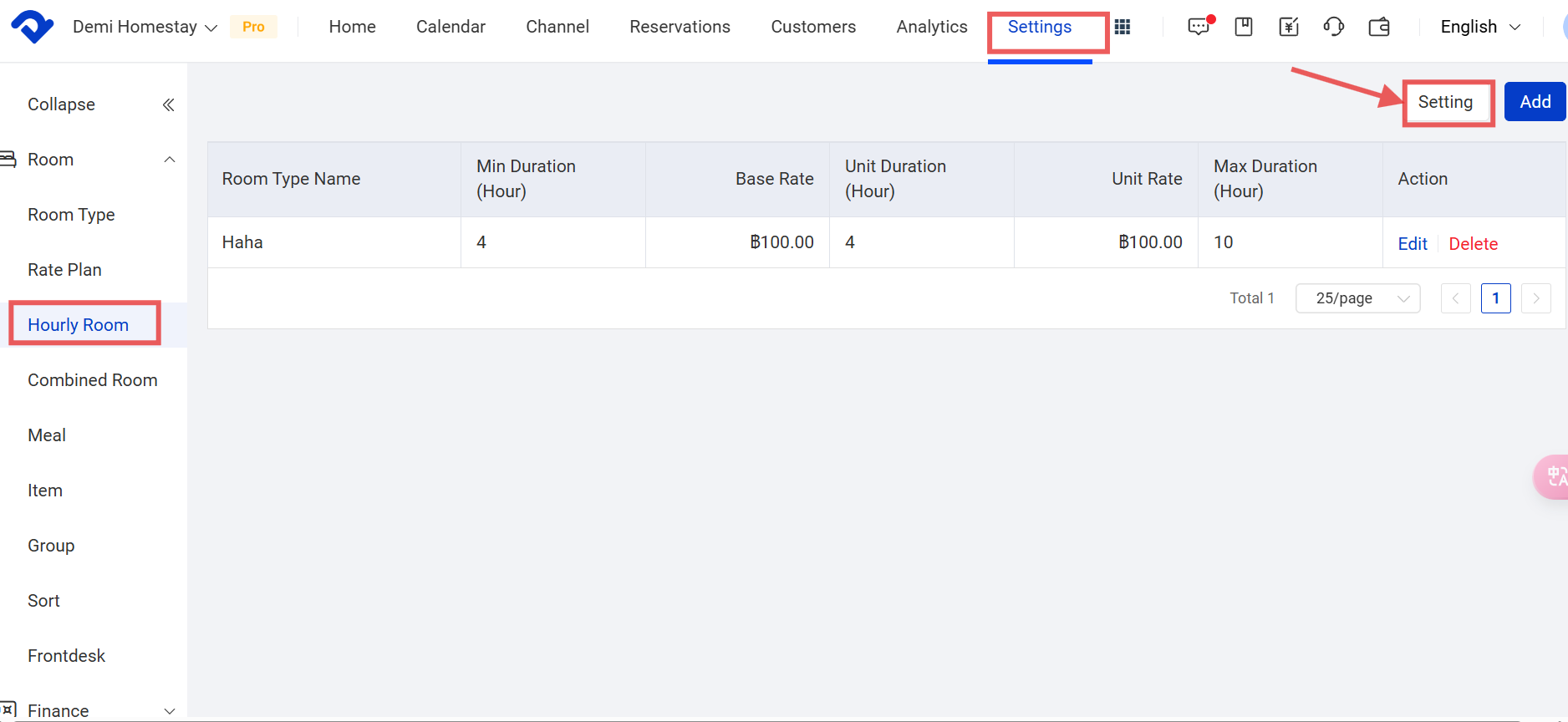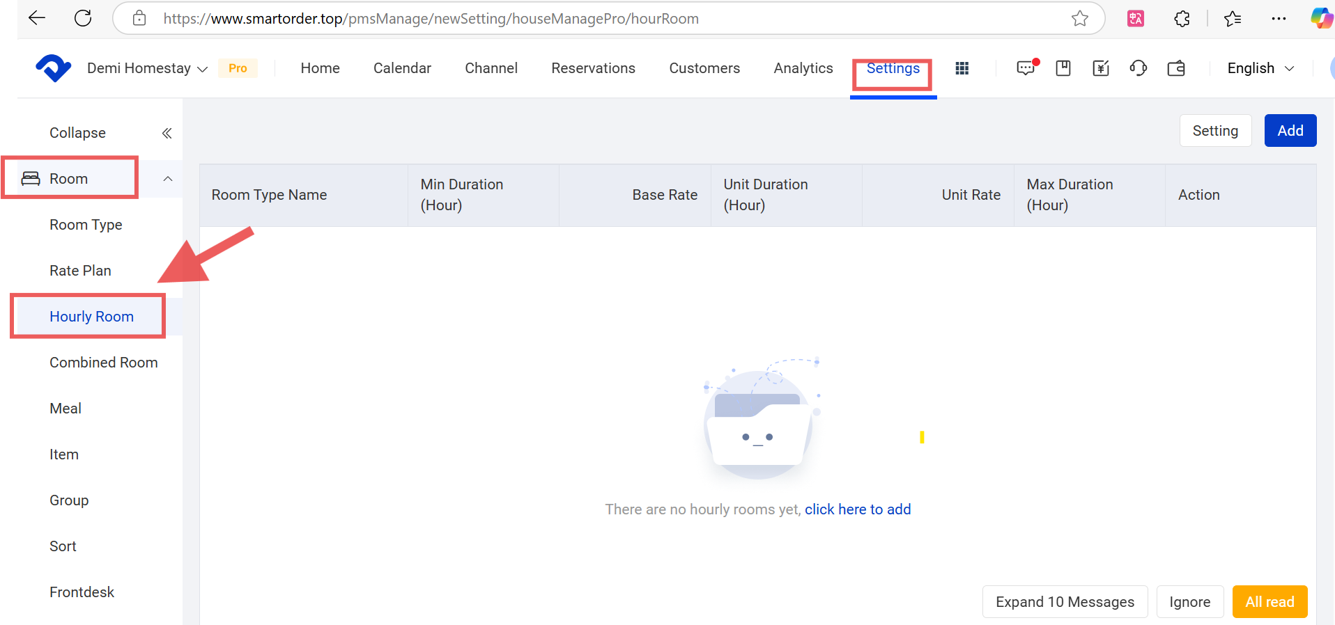 Step1: Go to the Settings page. Select Hourly Room from the Room drop-down list.