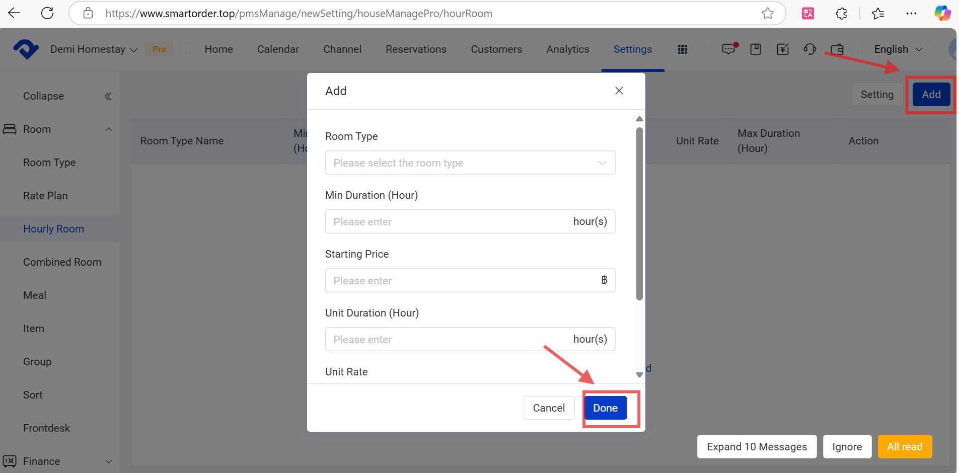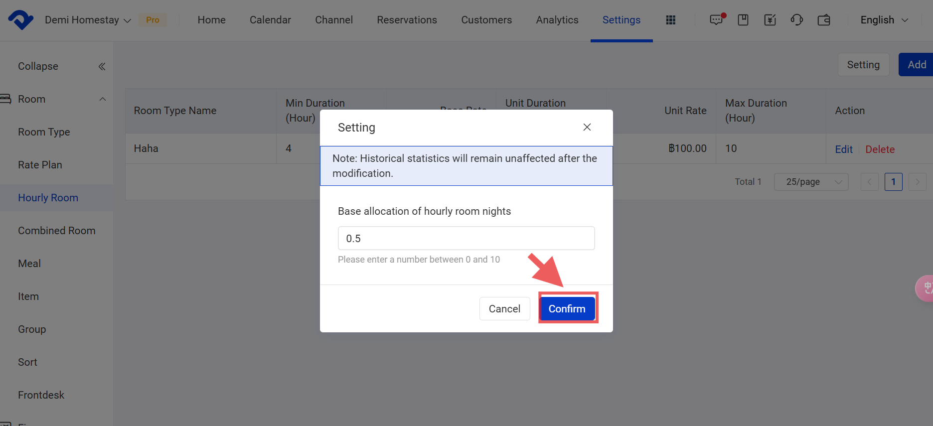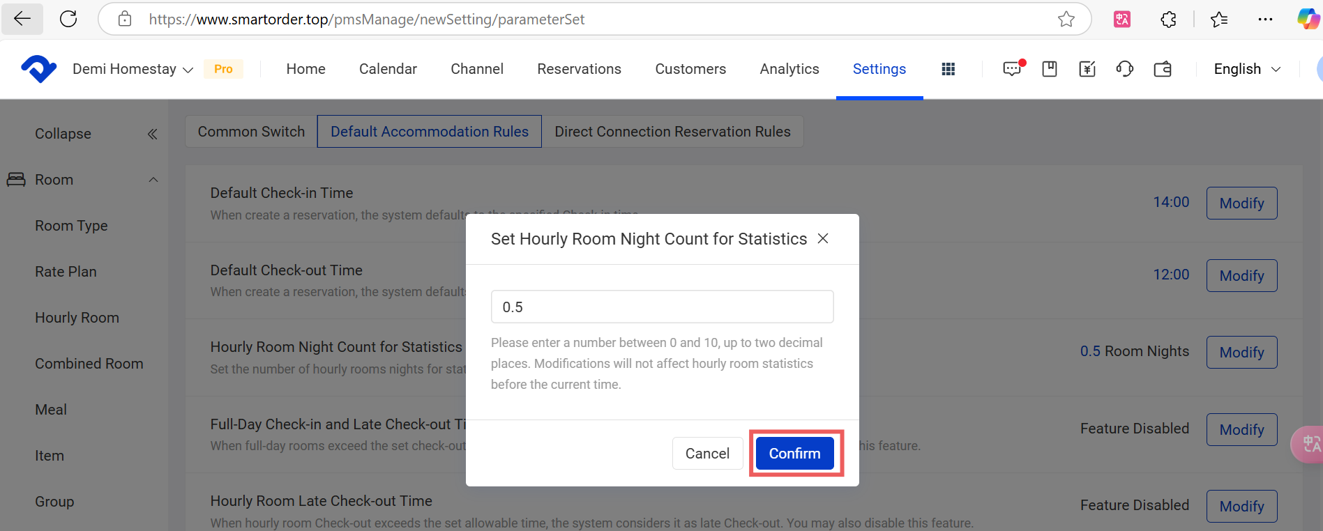 Way2: Go to the Settings page. Select Hourly Room from the Room drop-down list. Click Setting. After filling in the count, click Confirm.