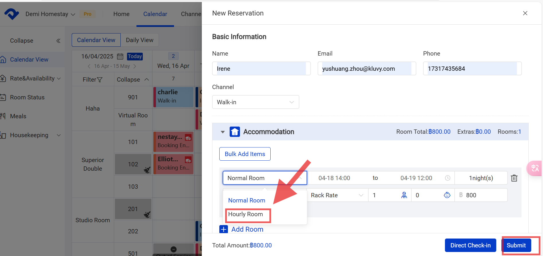 Step3: If you want to create an hourly order or change a reservation to an hourly room type, you can create or modify the reservation and choose Hourly Room. Click Submit.