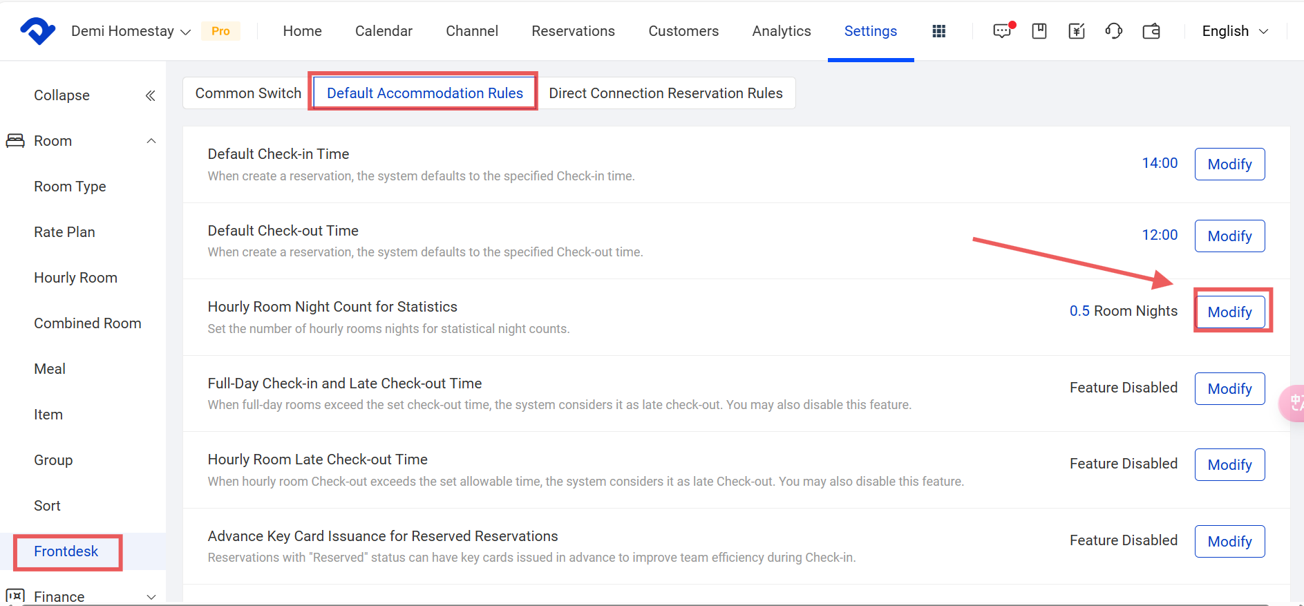 Way1: Go to the Settings page. Select Frontdesk from the Room drop-down list. Select Hourly Room Night Count for Statistics and click Modify. After you finish setting up the count, click Confirm.