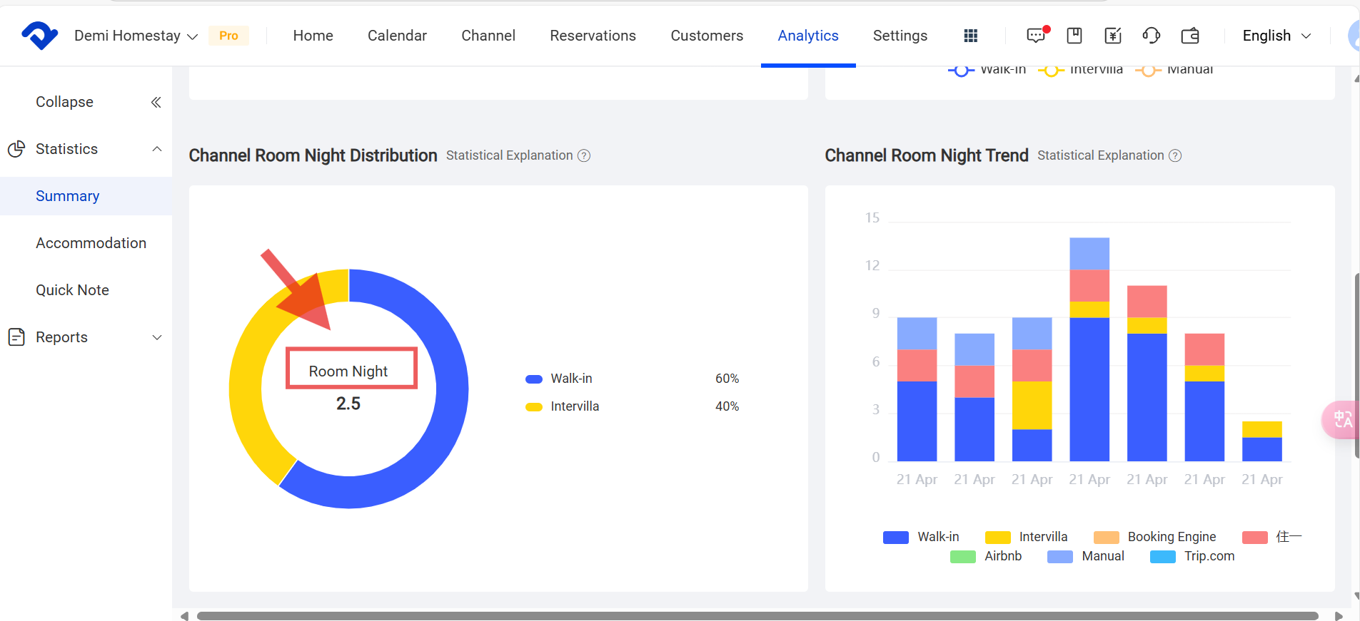 The Hourly Room Night Count for Statistics settings contributes to the analytics data. Each hourly room reservation will be counted as the room night according to your Base allocation of hourly room nights setting.
