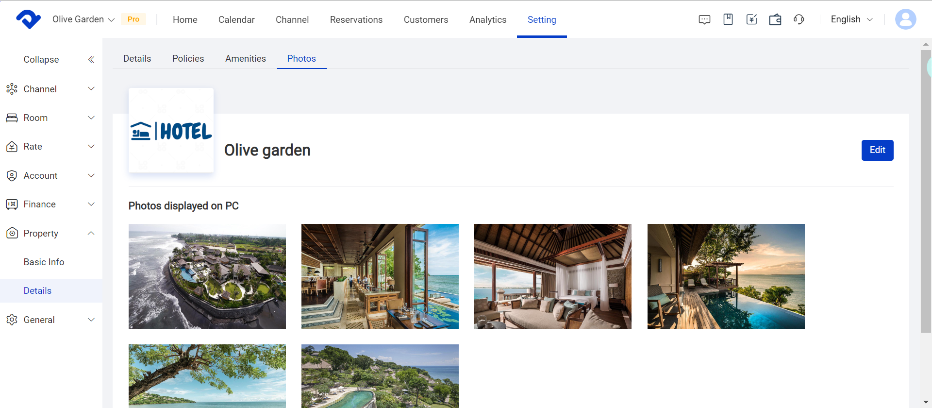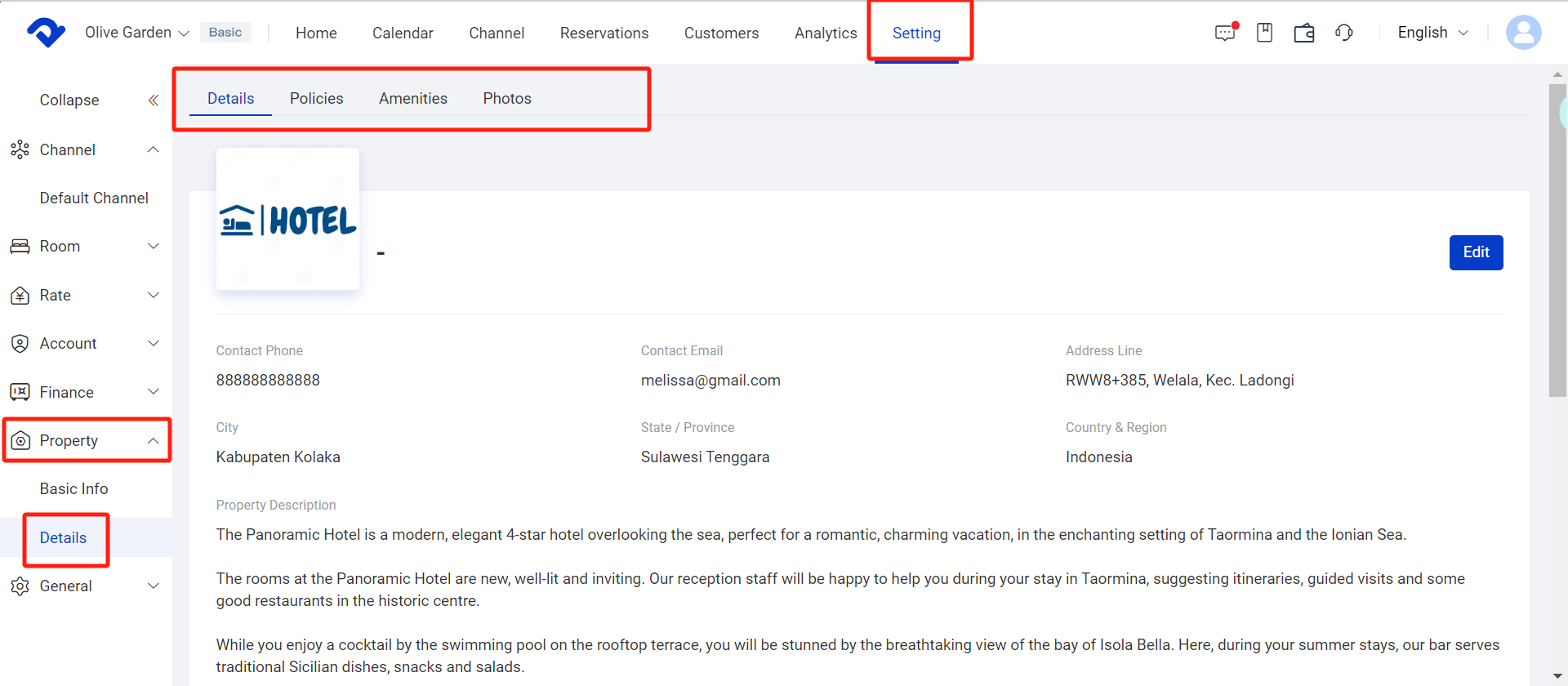 - Click Tab on the top to switch between Property Details, Policies, Amenities and Photos