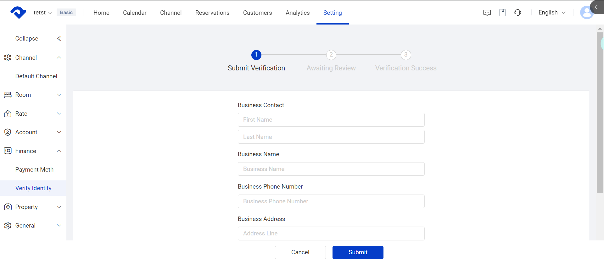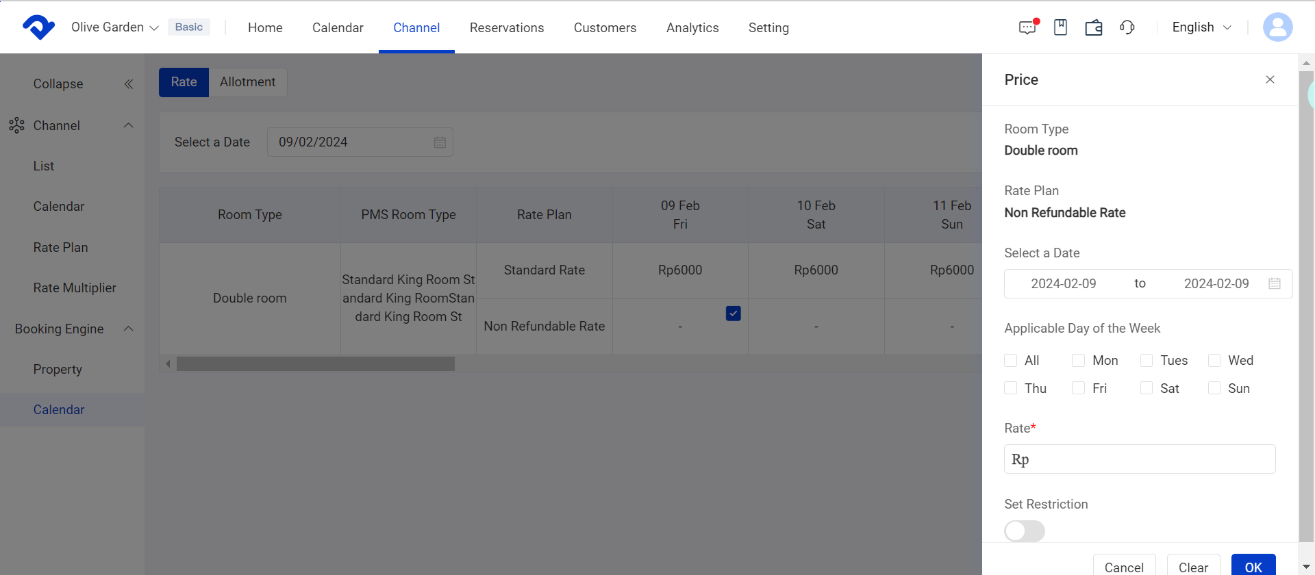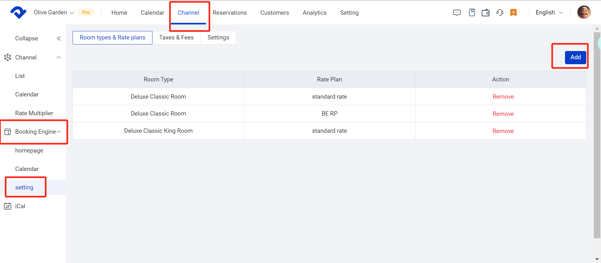 1. Click Channel on the top, and select Settings under the Booking Engine drop-down
