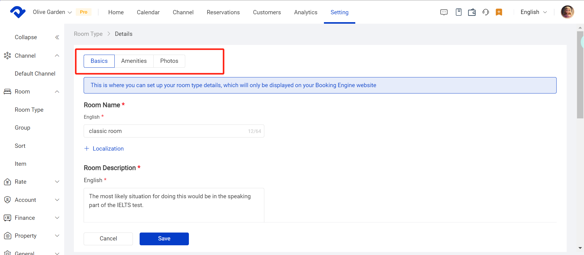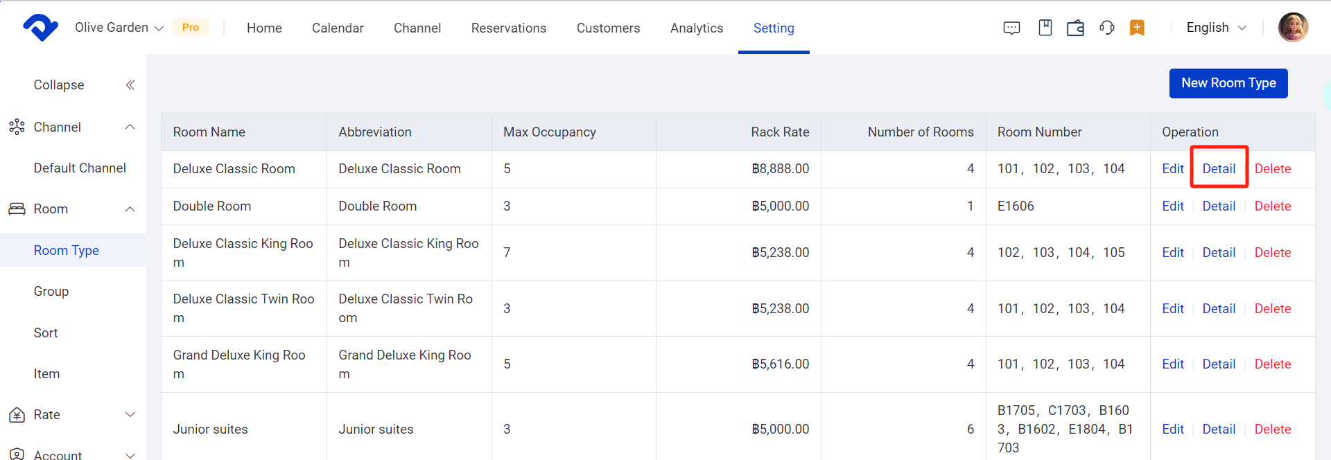 - Click Details in the room type list (If there is no room type, please add room type first)