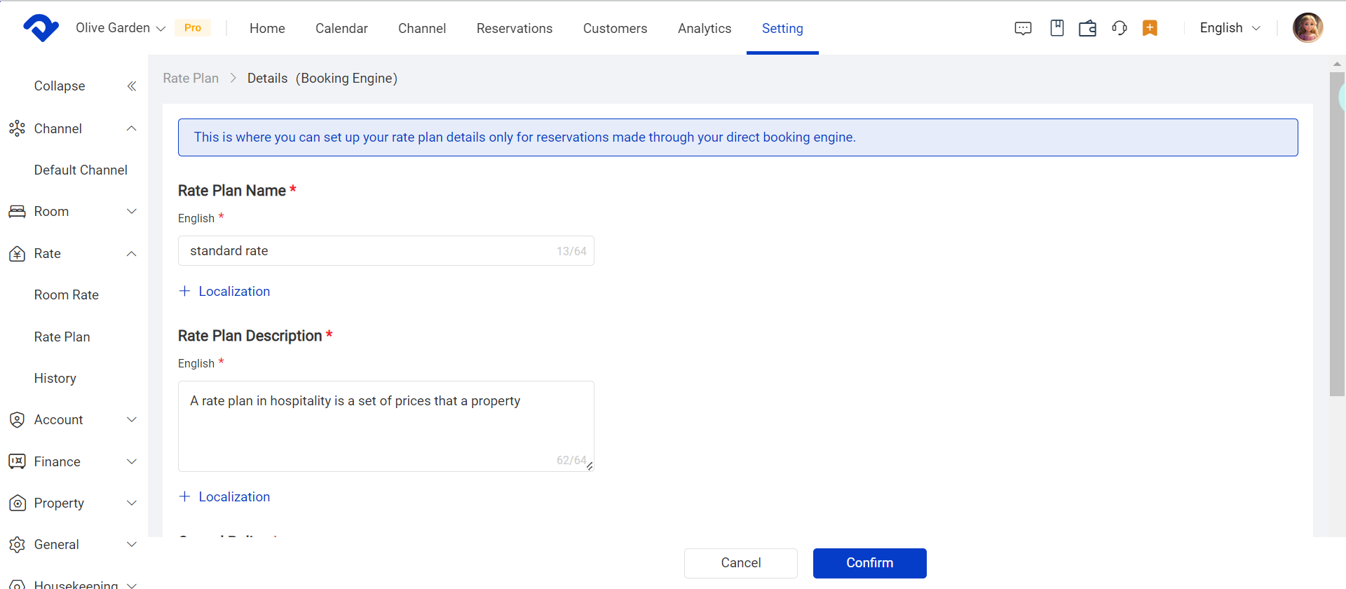 *You can click the +Localization button to add Chinese content to display on Booking Engine Chinese version