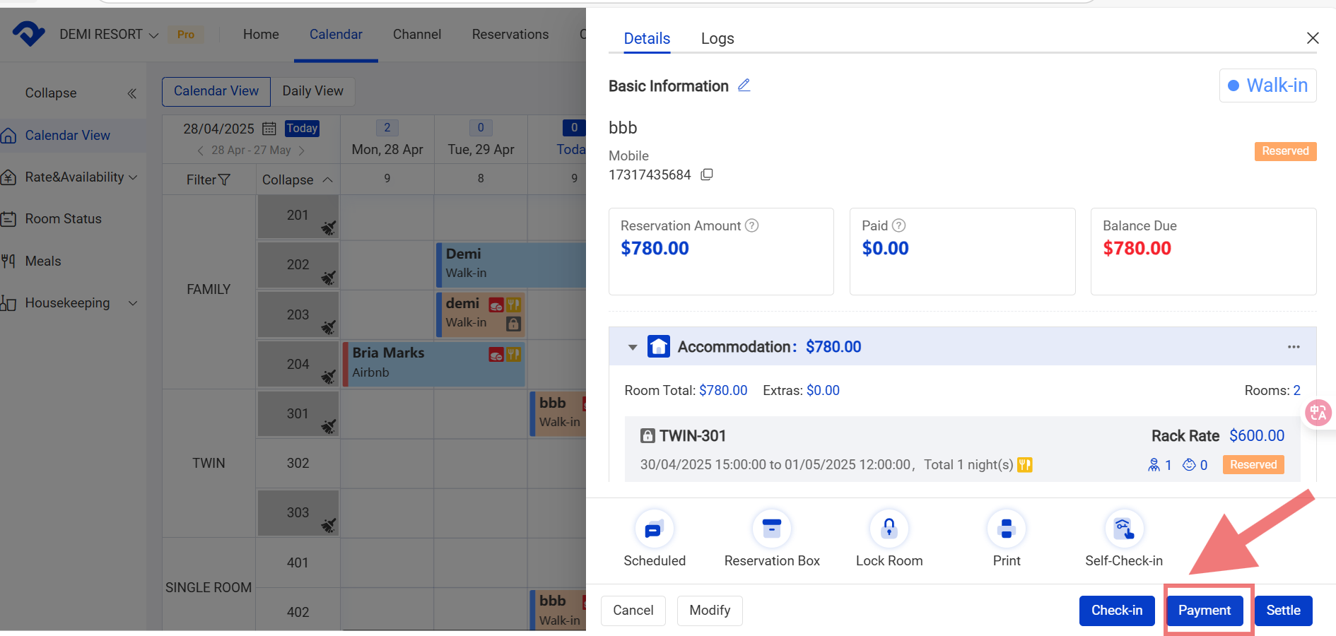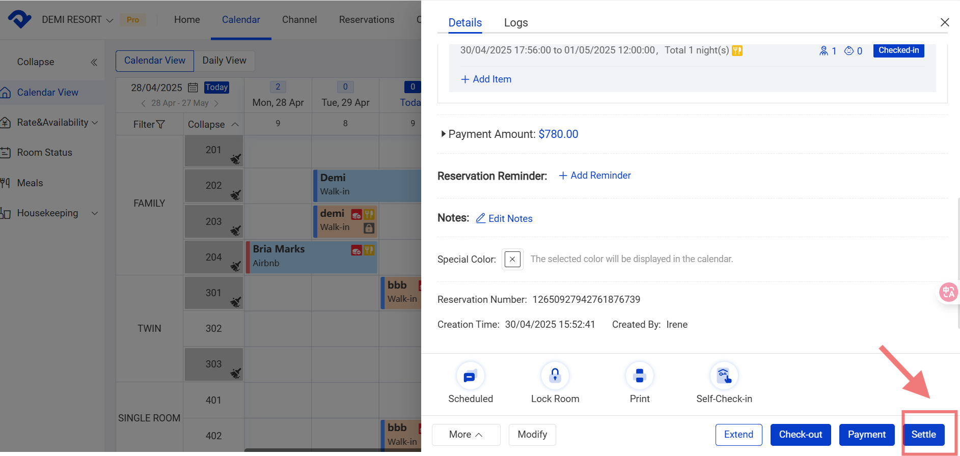 The reservation can be ended after being paid off. When you select Settle, the payment pop-up box will be displayed, and you should fill in the payment information to settle the reservation.