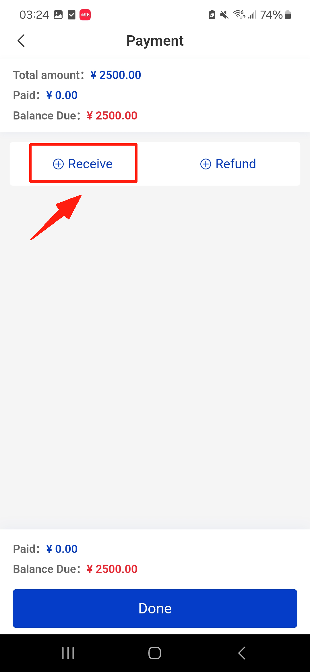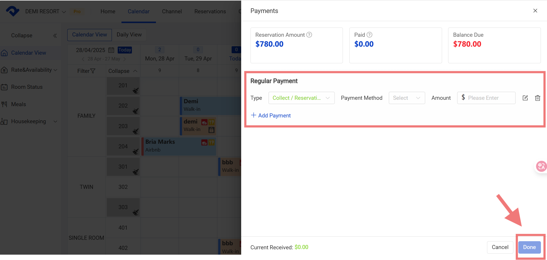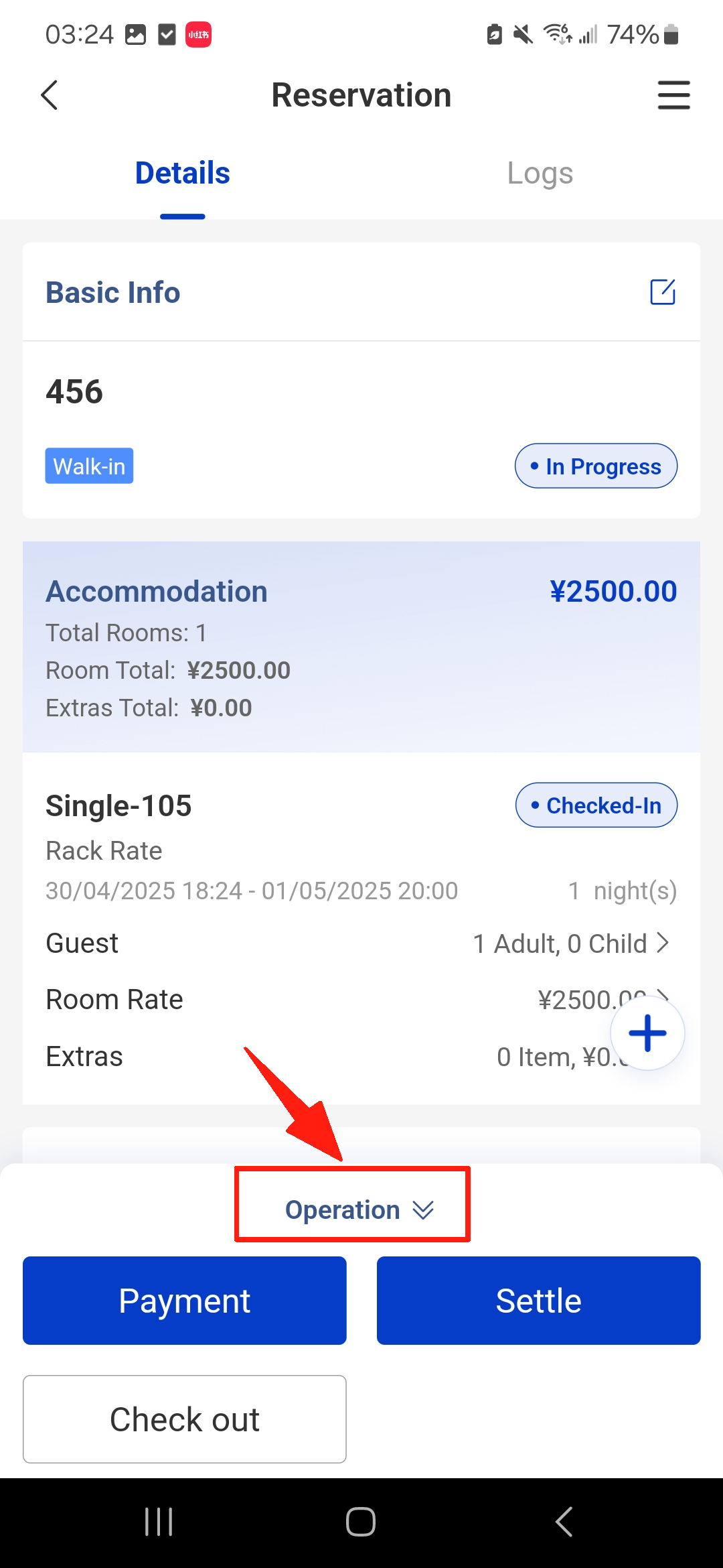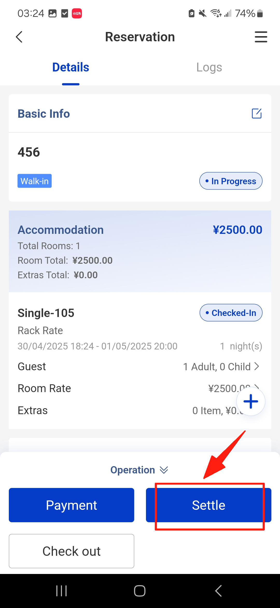 Go to the Reservation page and click Operation at the bottom to expand the options. Select Payment and click Receive on the Payment page. Select Done and Settle. The reservation ends.