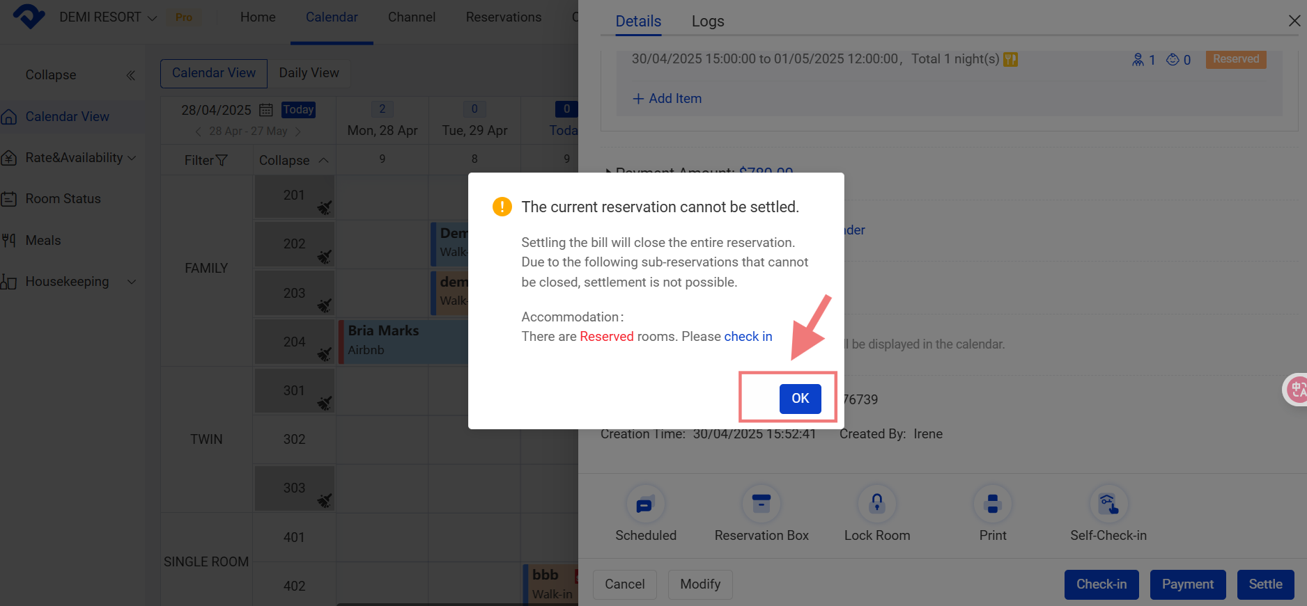 Step3: If it is a reserved one, there will be a pop-up box reminding you to check in first to settle it. After checking in, you can settle the reservation.