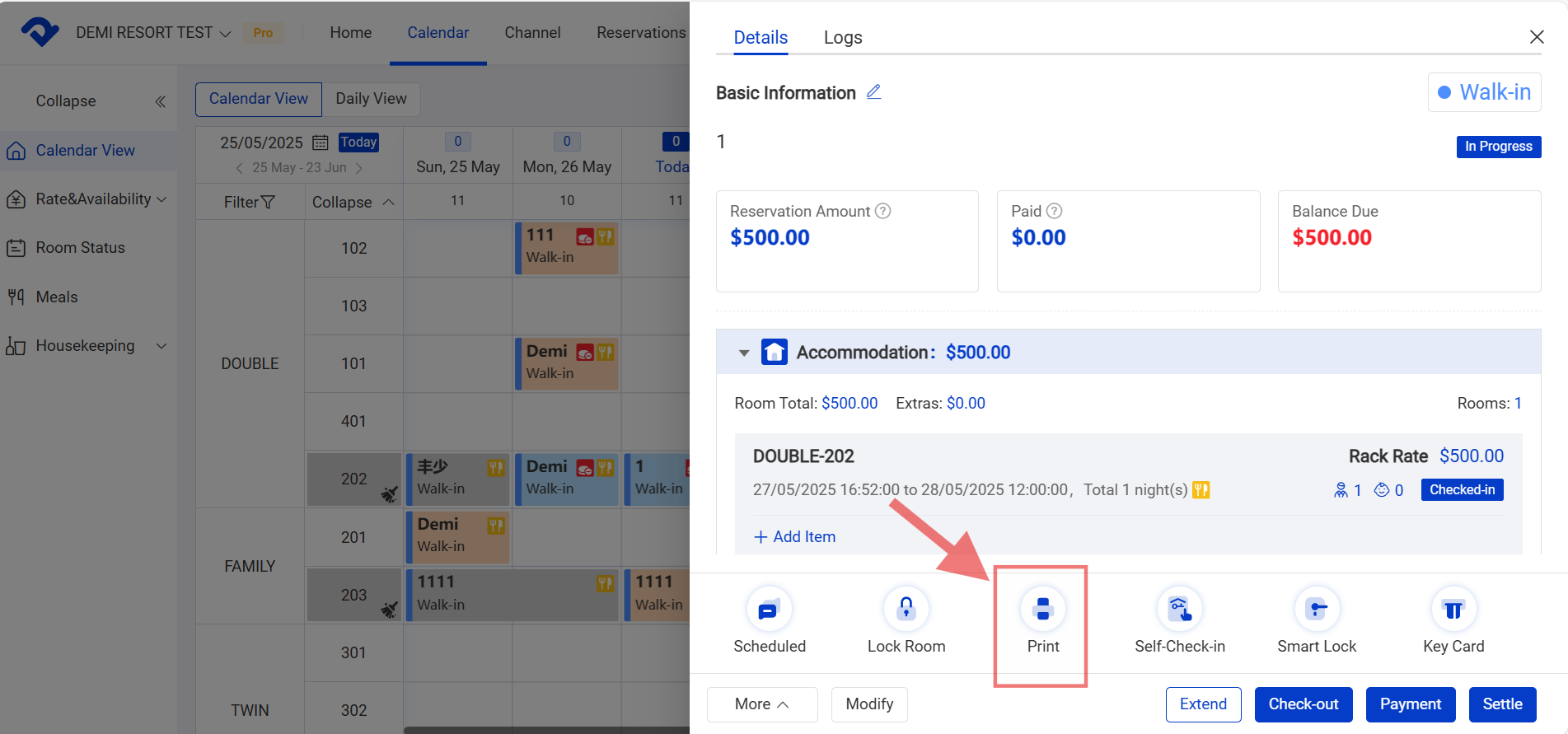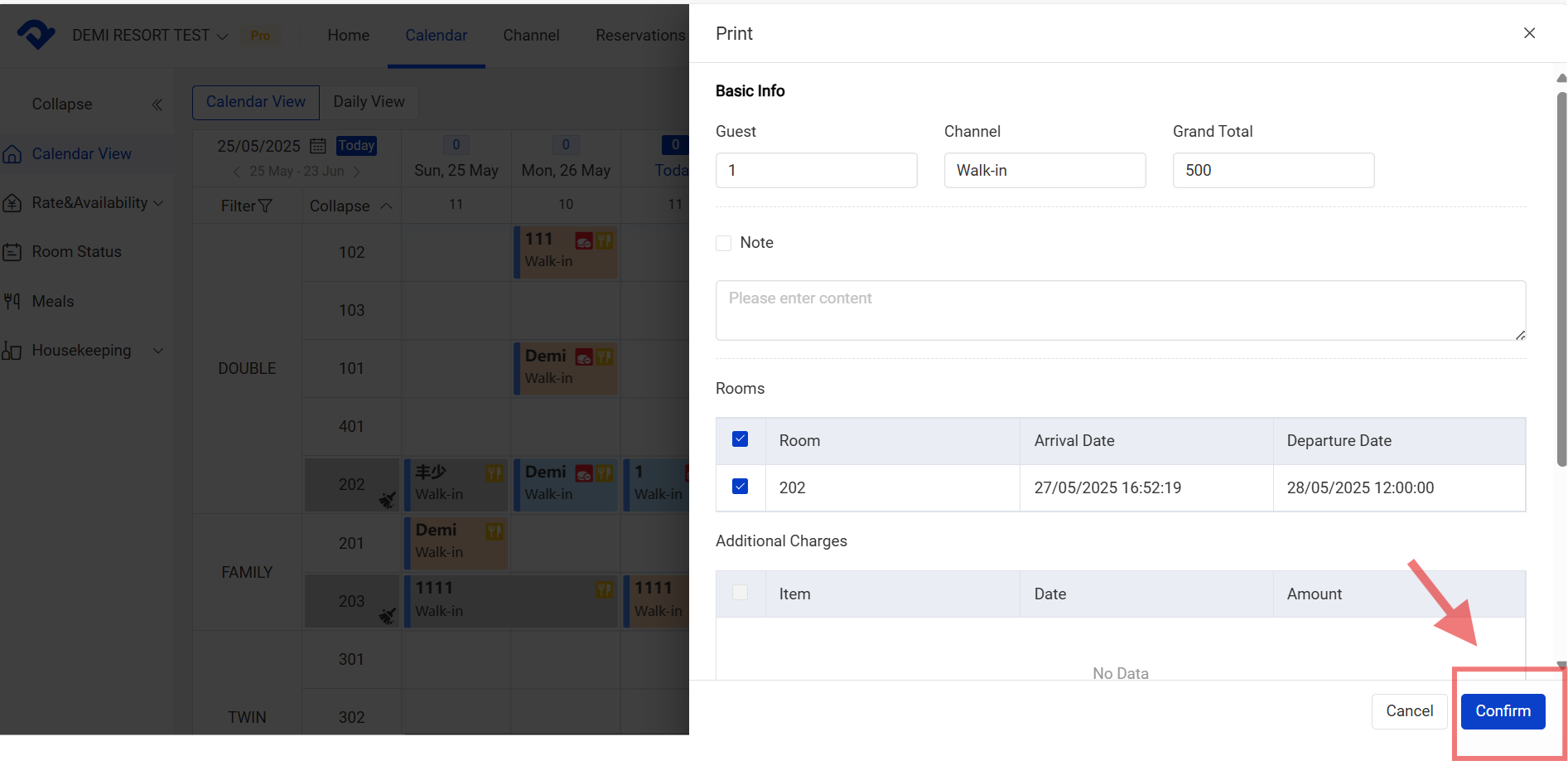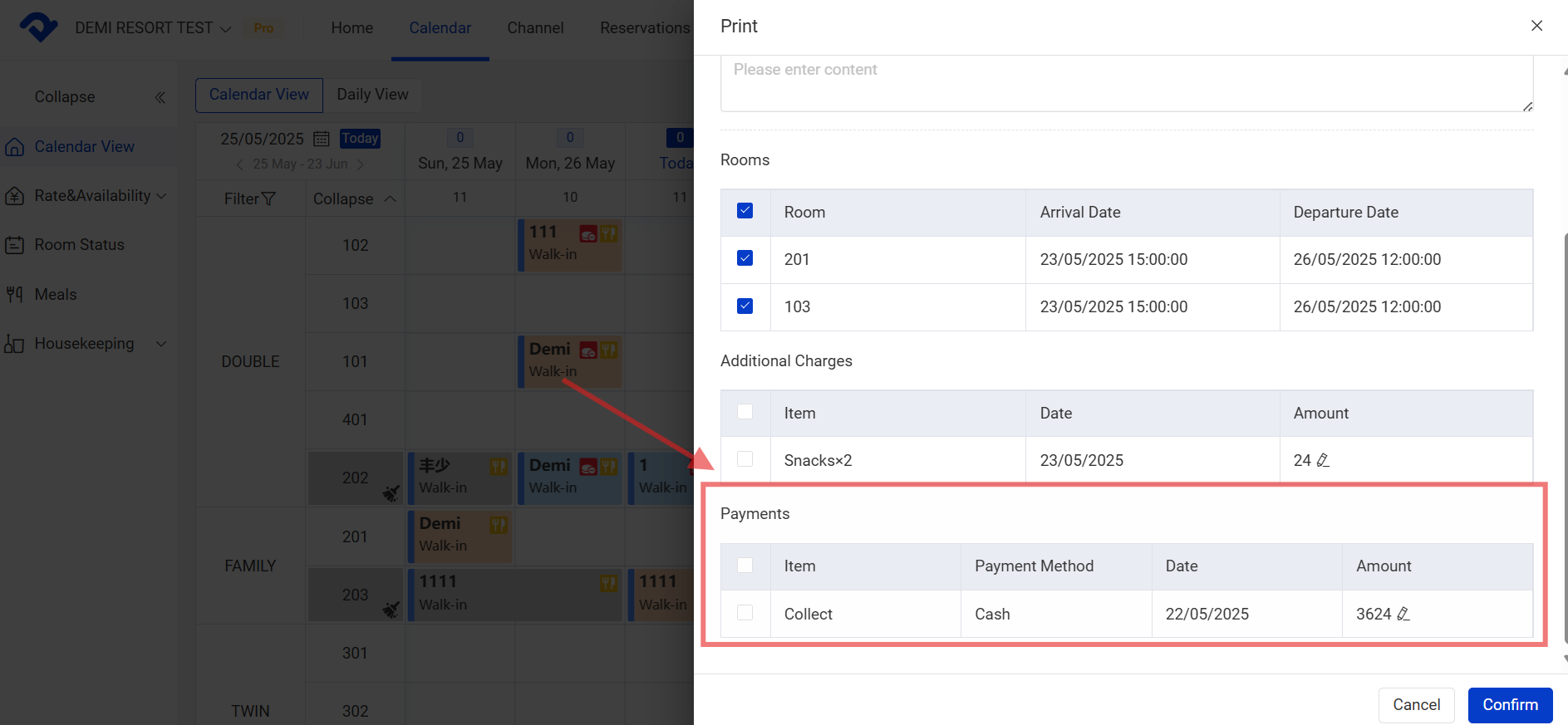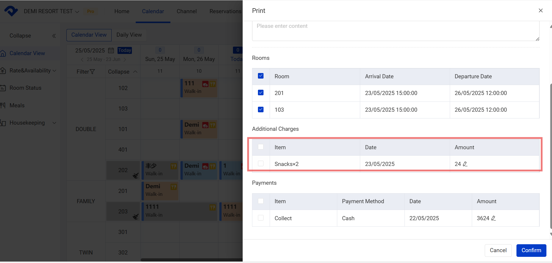 The reservation Print function supports printing Basic information, Rooms information, Additional charges, and Payments information.