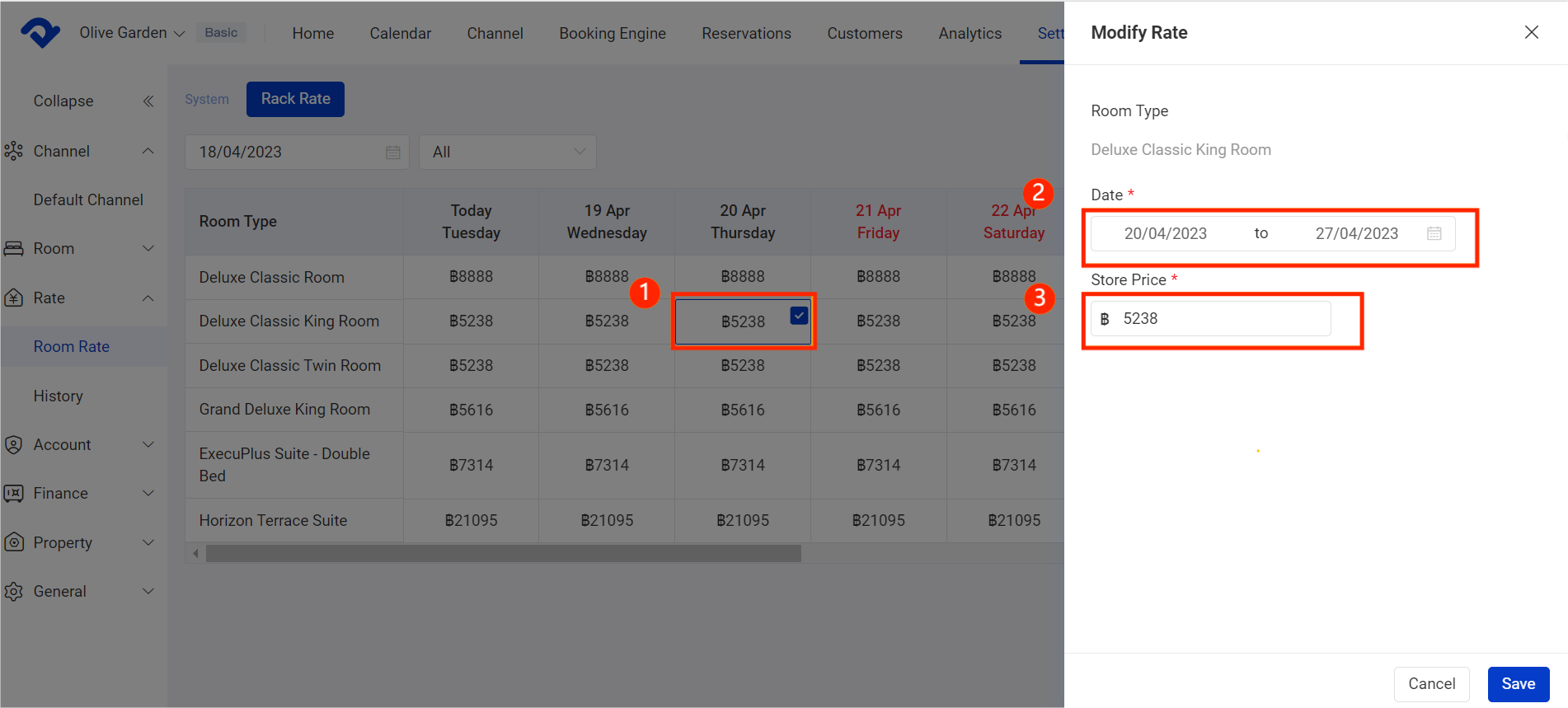 The rack rate for a hotel room is the published rate for one night’s stay without any discounts or premiums included. Rack rates are the highest price that a hotel will charge for a room. Your room type price defaults to the price you filled in when creating the room type until you update your daily prices.
