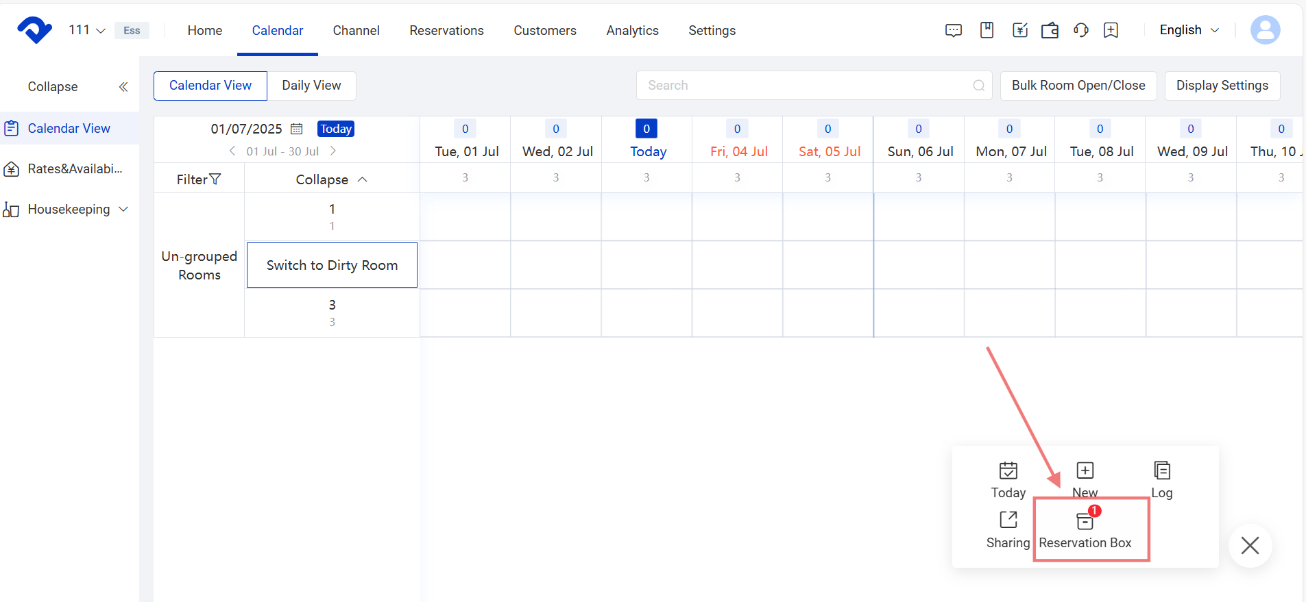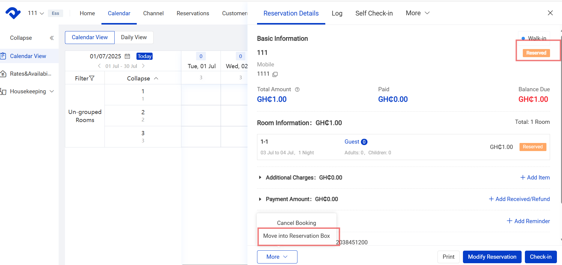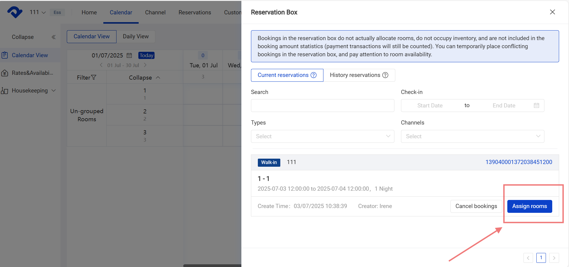 Bookings in the reservation box do not actually allocate rooms, do not occupy inventory, and are not included in the booking amount statistics (payment transactions will still be counted). You can temporarily place conflicting bookings in the reservation box, and pay attention to room availability.