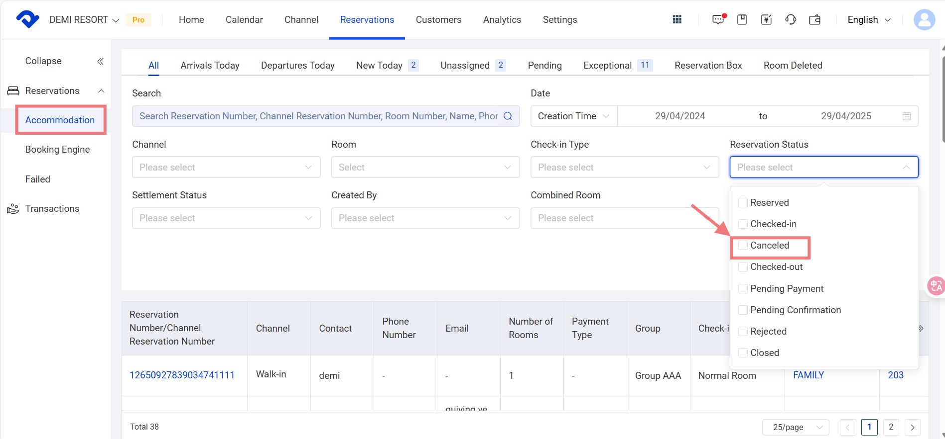 Go to the Reservation page and select Accommodation from the Reservation drop-down list. Select Canceled from the Reservation Status drop-down list.