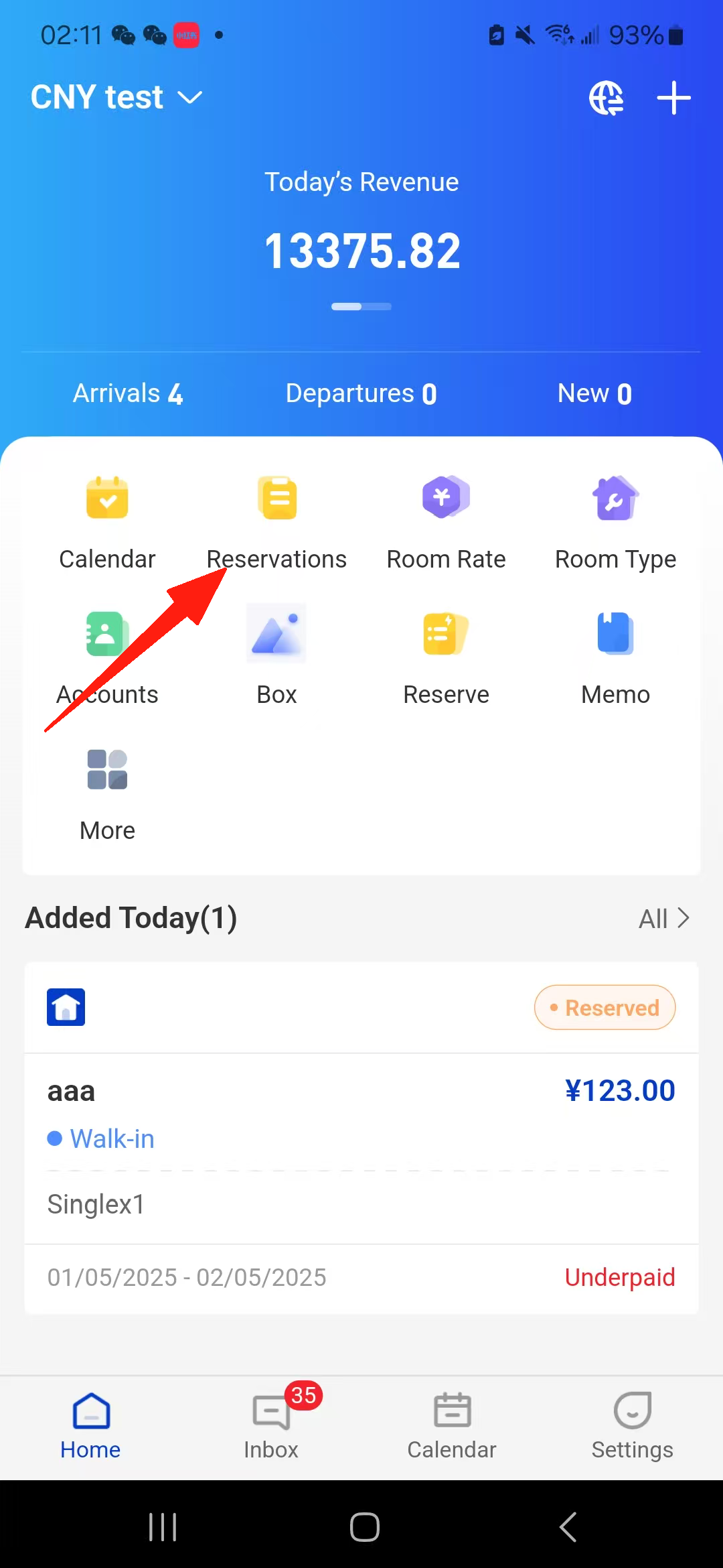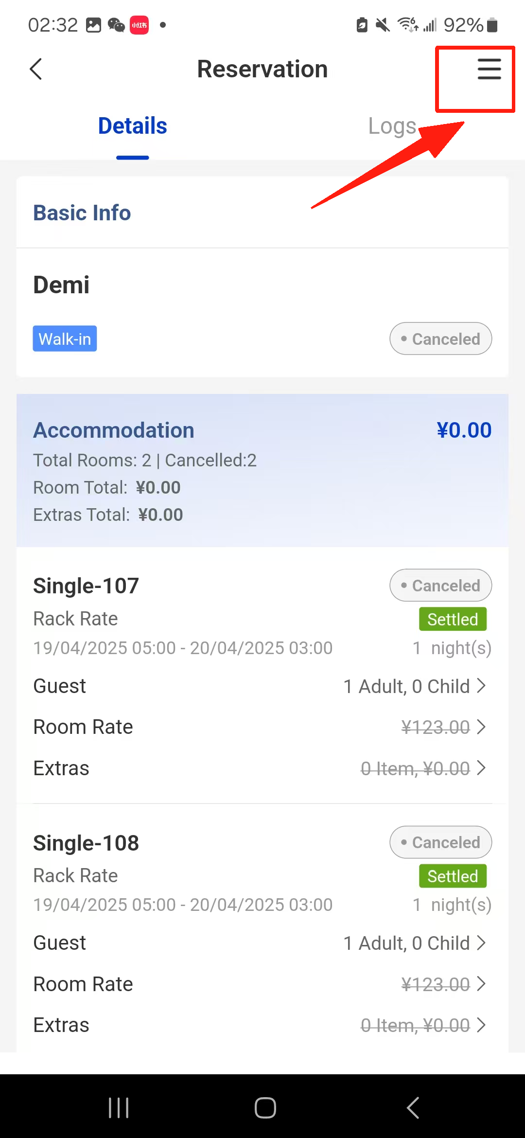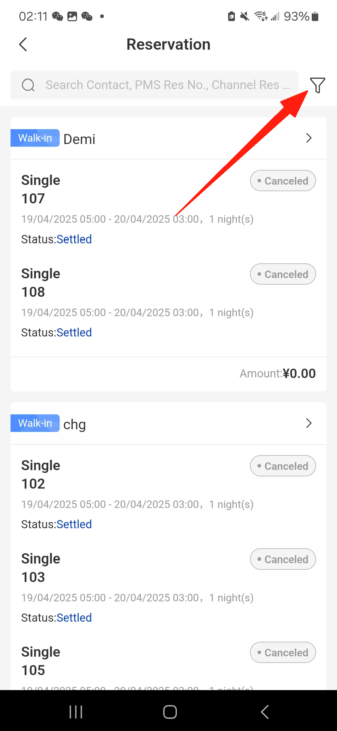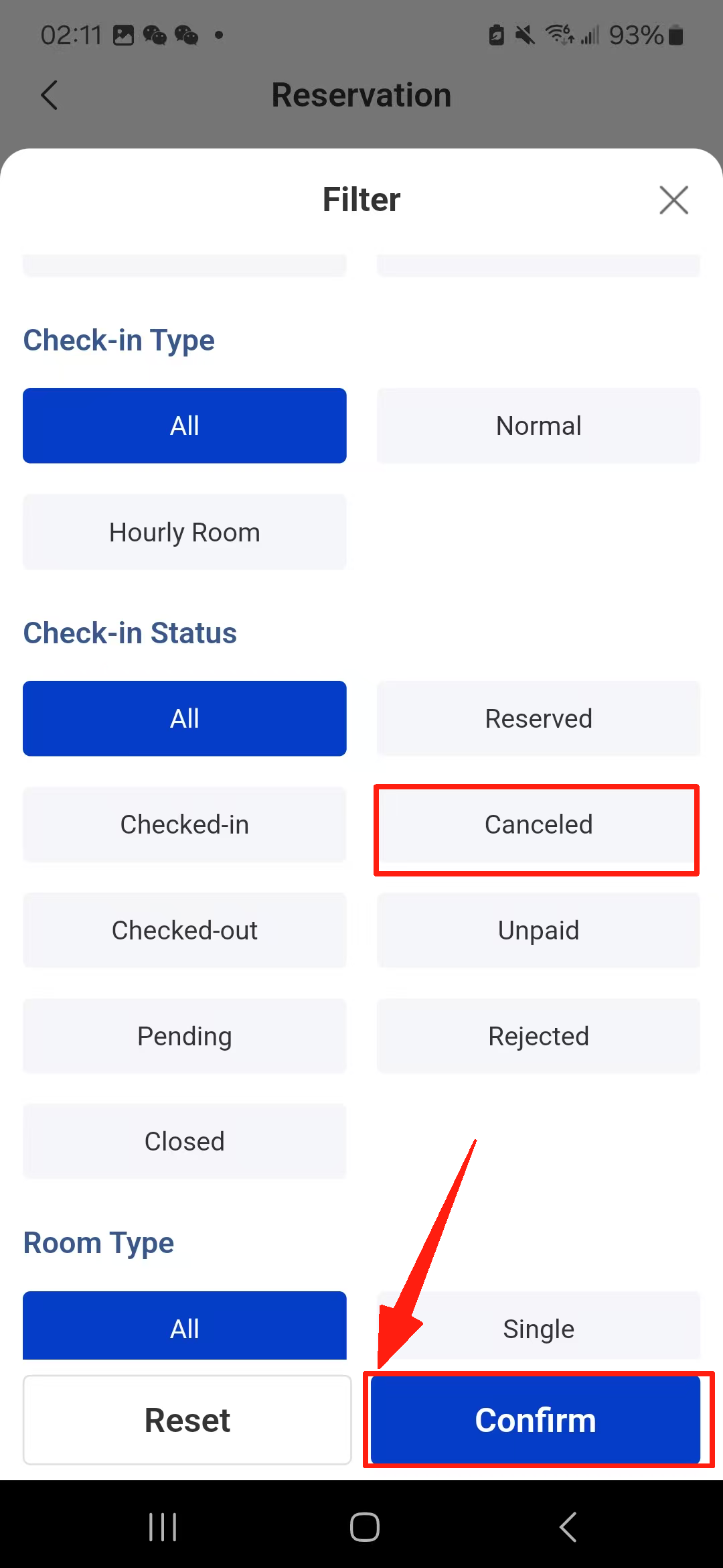 Go to the Home page on the APP and select Reservation. Select the filter icon and click Canceled in the Check-in Status. And then click Confirm.