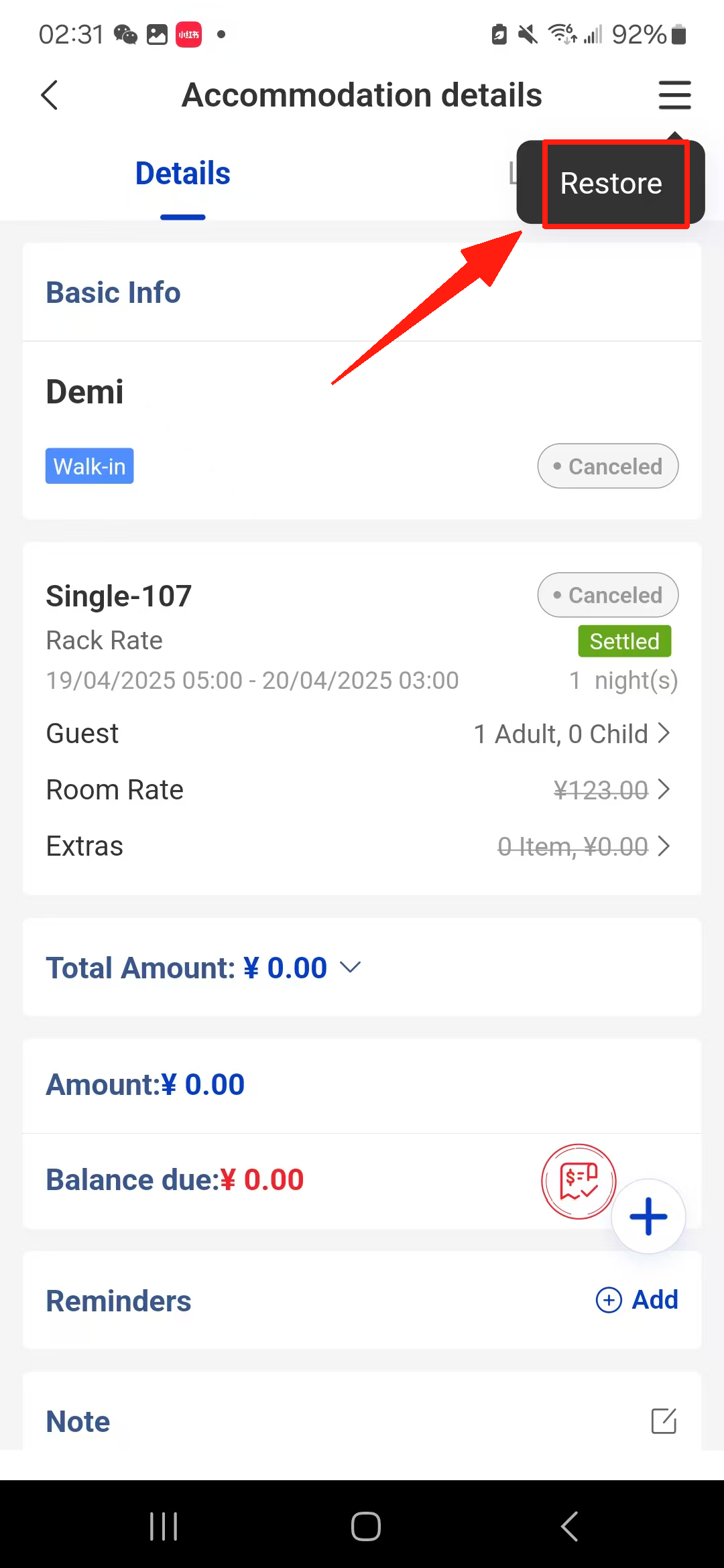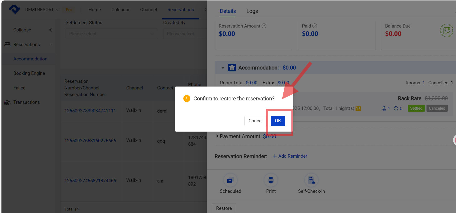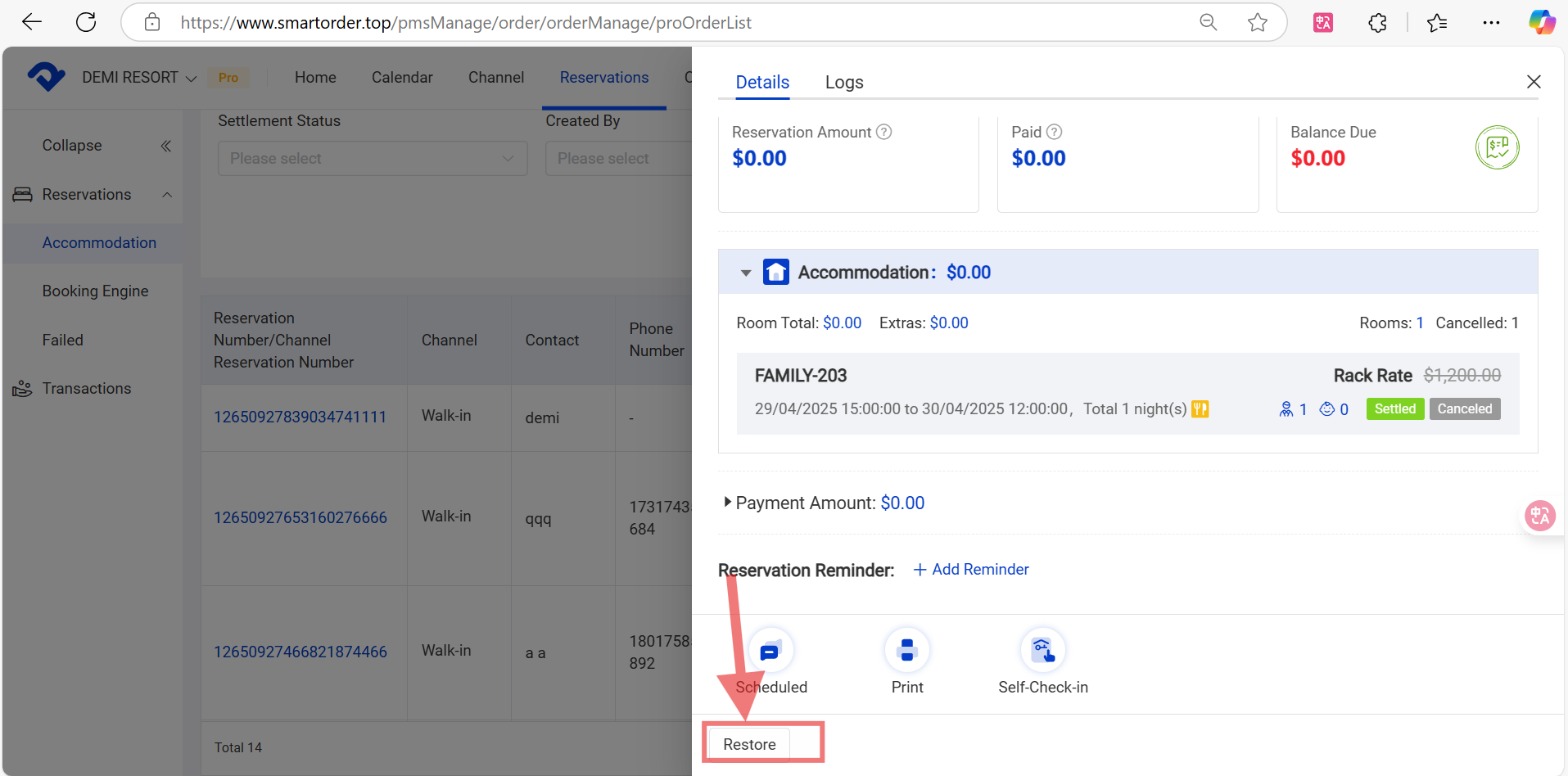 Click the canceled reservation/ room and go to the Details page. Select Restore and OK in the pop-up box.