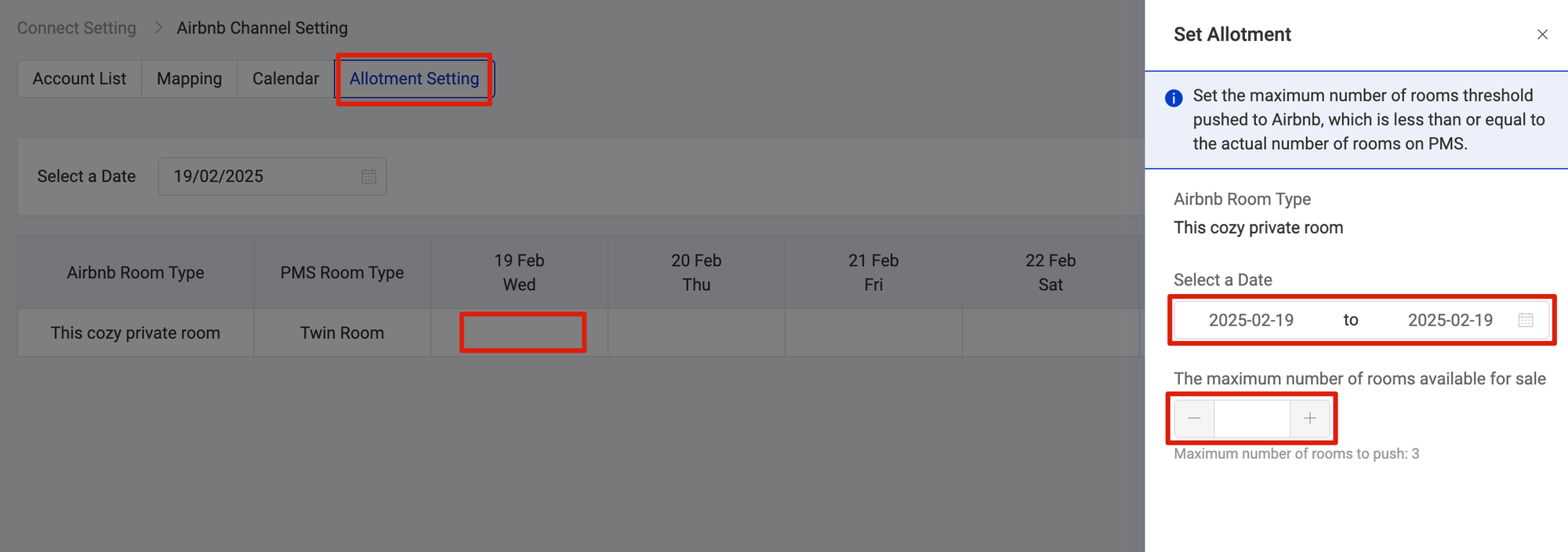Go to Channel > List > Configure > Click Allotment Setting > Click on blank date > Select a Date > Fill in the number of rooms