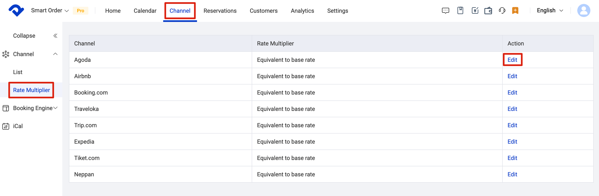 The Rate Multiplier in the Smart Order PMS is channel-specific. For instance, you can offer a 5% discount from your base rate exclusively for Booking.com without applying it to other OTAs. To achieve this, you would set a -5% adjustment for each room type in the Rate Multiplier section of the Booking.com channel.