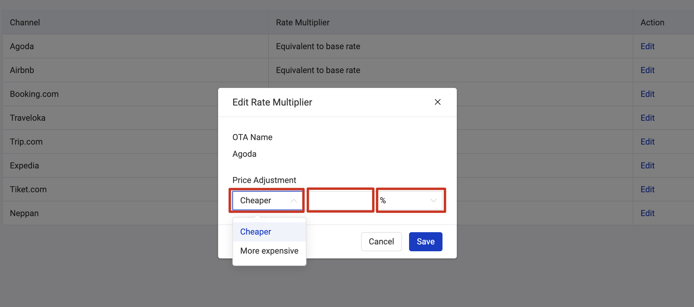 Go to Channel > Rate Multiplier > Click on the channel you want to Edit > Select the 3 options in Price Adjustment
