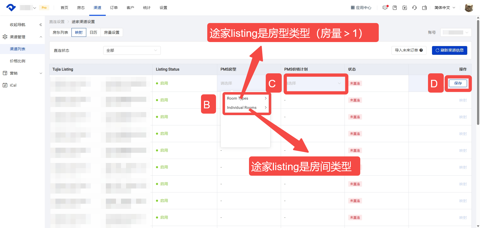 B.选择类型,并选择与listing对应的PMS房型/房间