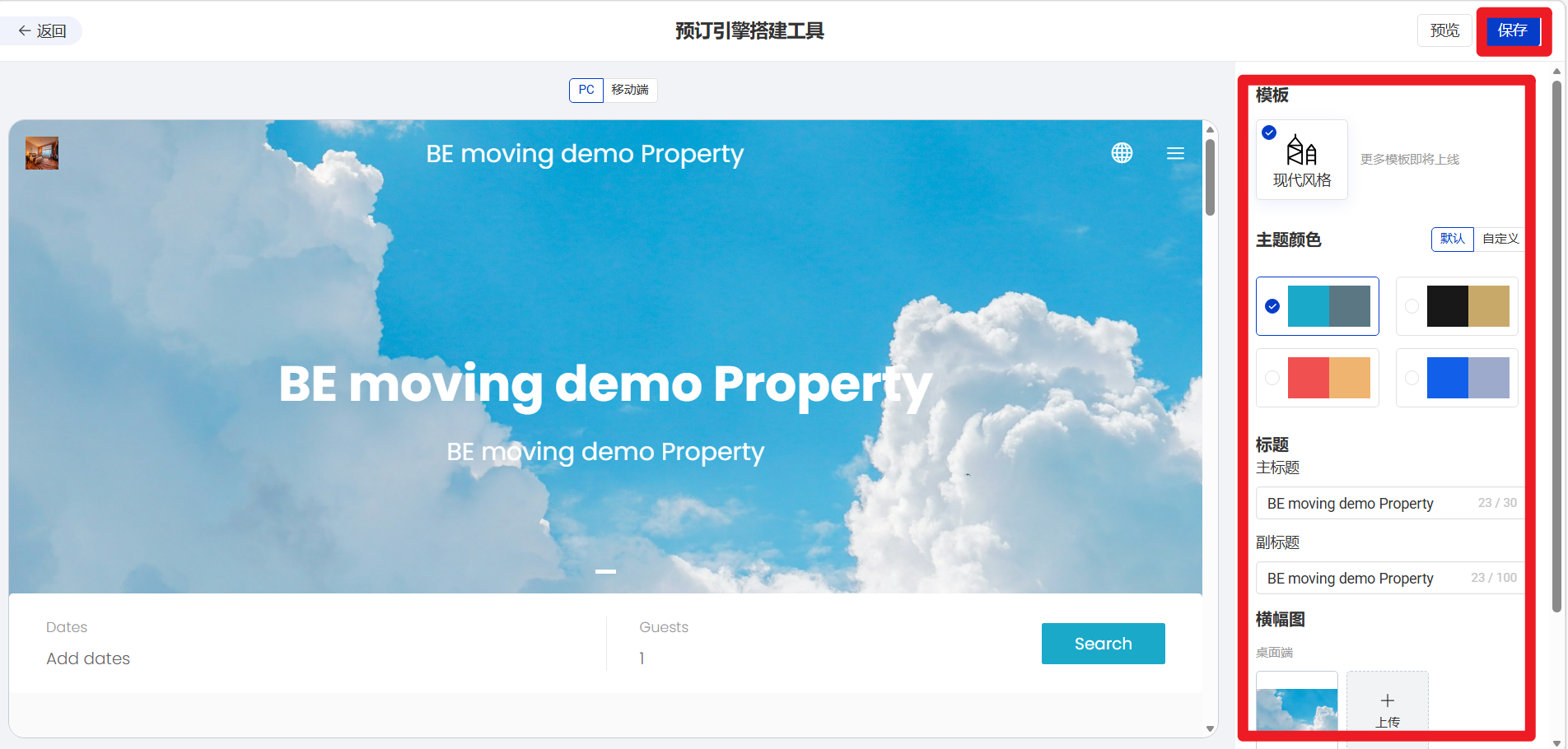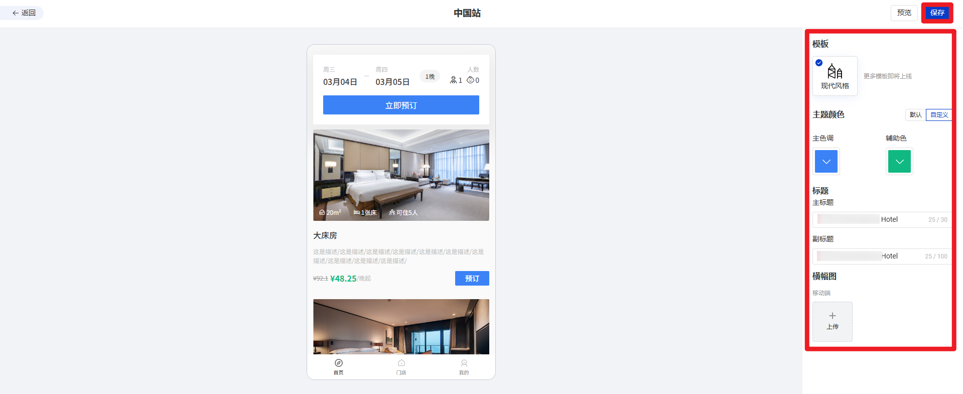 ・例如配置Booking Engine网站的主题色、Banner图片、标题、副标题