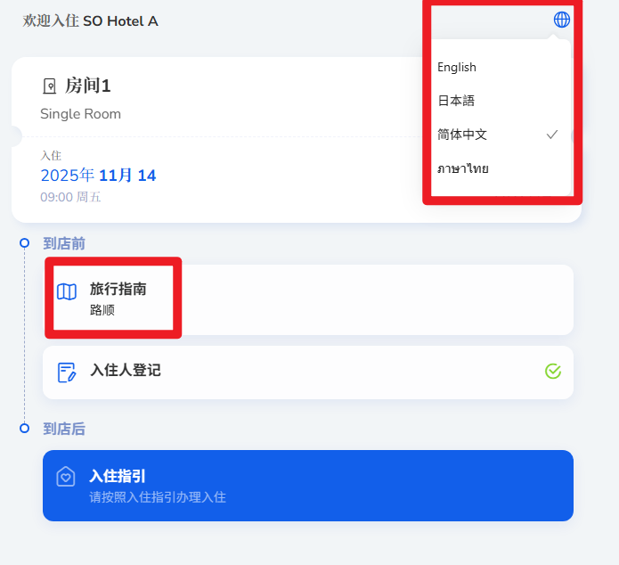- 到店前客人可点击【旅行指南】查看商家在PMS系统内上传的PDF文件