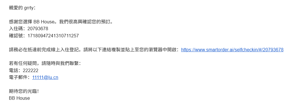 - 客人预定后会收到一封由系统发送的中日英三语自助入住消息,指引客户前往自助入住网站完成入住登记。消息内含客户姓名、入住码、PMS订单号、该订单的自助入住网站链接、门店信息等内容