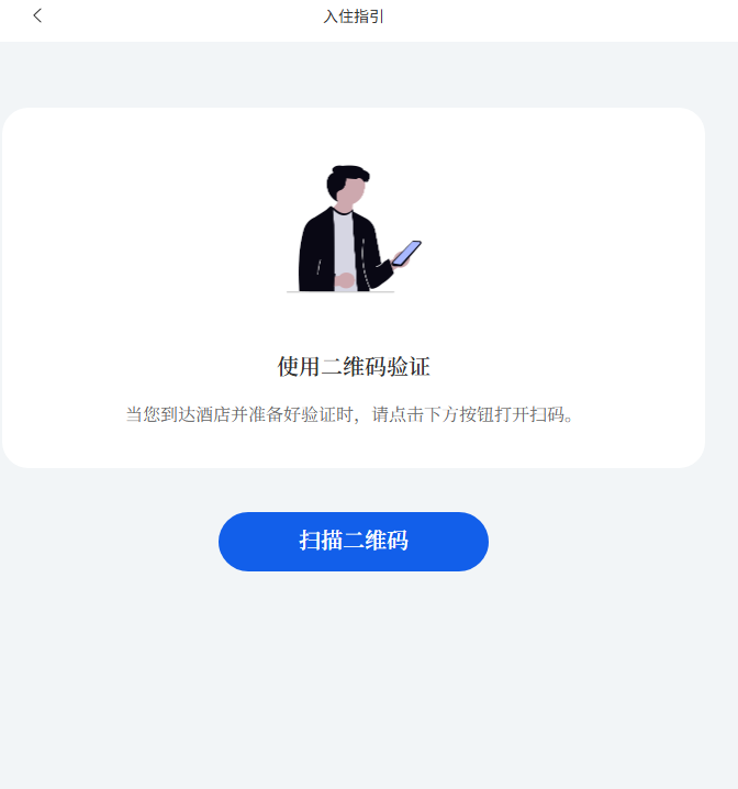 9.2 在开启现场认证的情况下,客人点击入住指引后会跳转至扫码界面。系统会提示客人在酒店现场扫码完成身份认证步骤7后查看入住指引