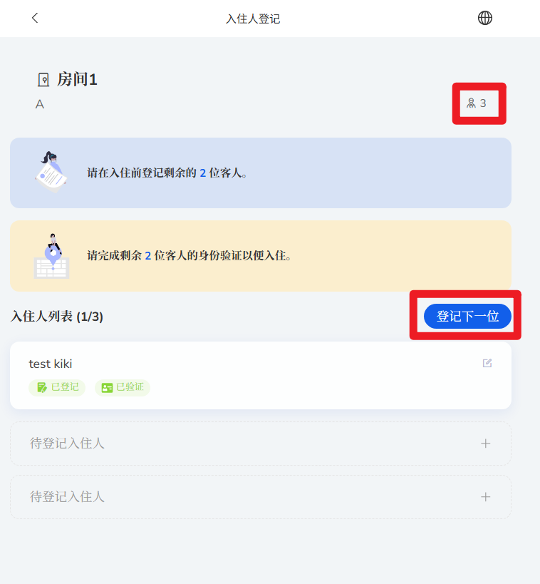 8.2 如果填写完一份表单后【入住人登记】步骤仍显示未完成,则还需完成其他入住人的表单登记和身份认证。表单登记界面右上方会展示当前订单总人数,即需完成登记的总人数。