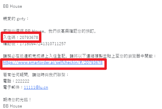 新版selfcheckin email会直接展示链接,无需输入入住码进行查单操作。可引导客人查看消息或复制链接,用浏览器打开进行入住登记和查看入住指引