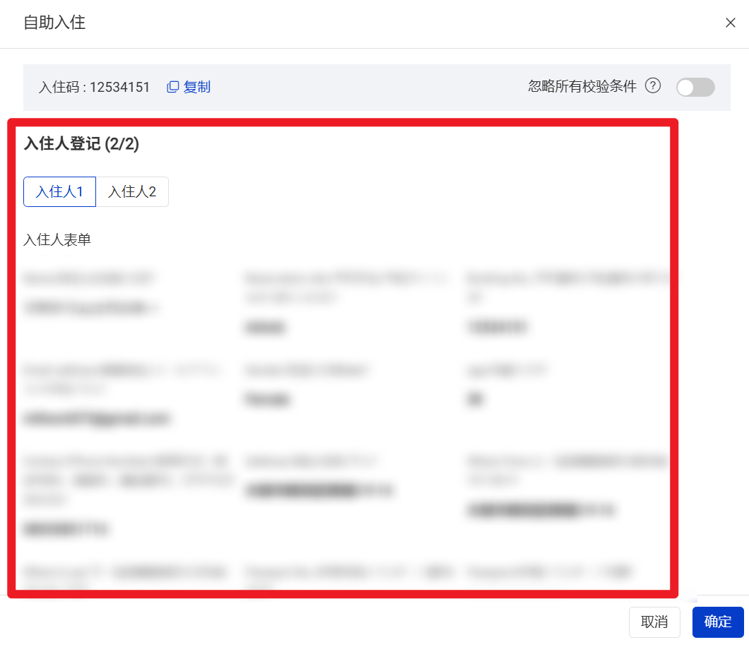 (2)情况2 表单未填写完成,需提供其他入住人的表单信息或身份认证。可以参考自助入住设置方法 里面的第三步【三、入住指引】--调整显示条件