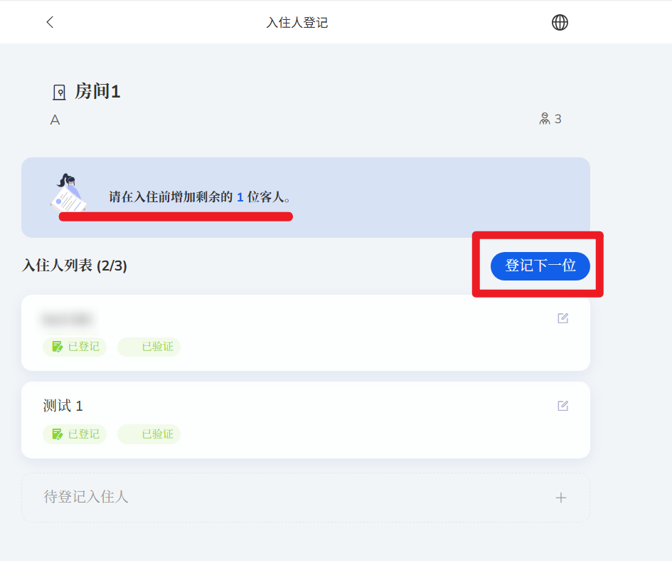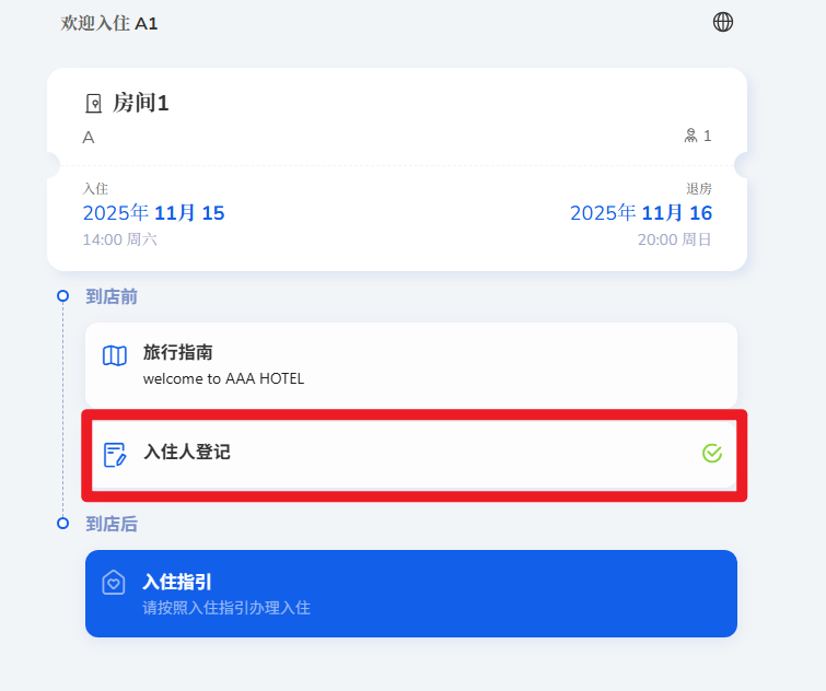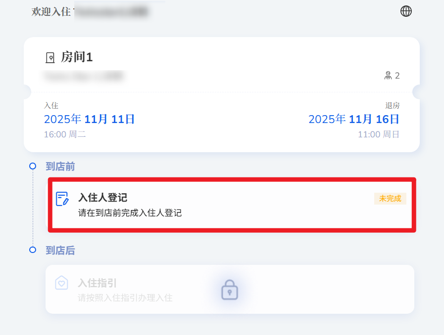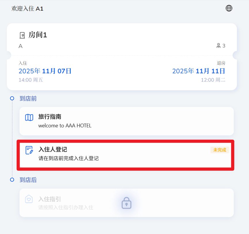 方法2:参考上述问题2,将入住码输入自助入住网站,可进入客人的入住界面。入住人登记未完成会显示“未完成”图标,点进去可继续完成登记步骤