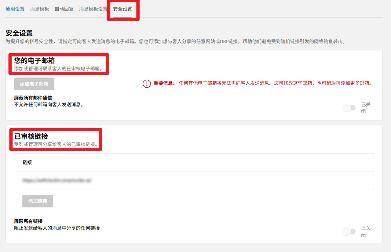 情况1 Booking后台设置了仅允许部分邮箱给客人发送消息/仅允许发送部分指定链接,请删除您添加的所有链接
