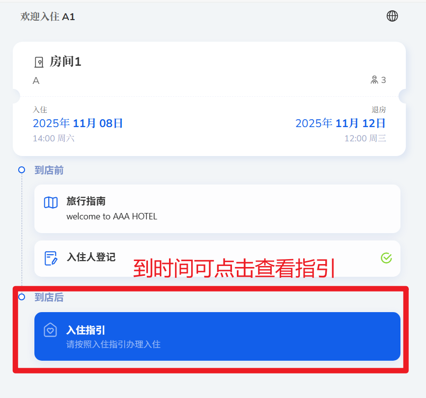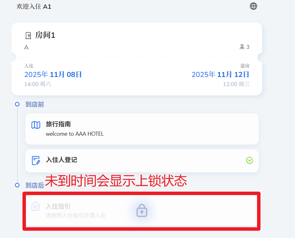 (3)情况3 未到入住指引可查看时间。可以参考自助入住设置方法 里面的第三步【三、入住指引】--调整显示时间